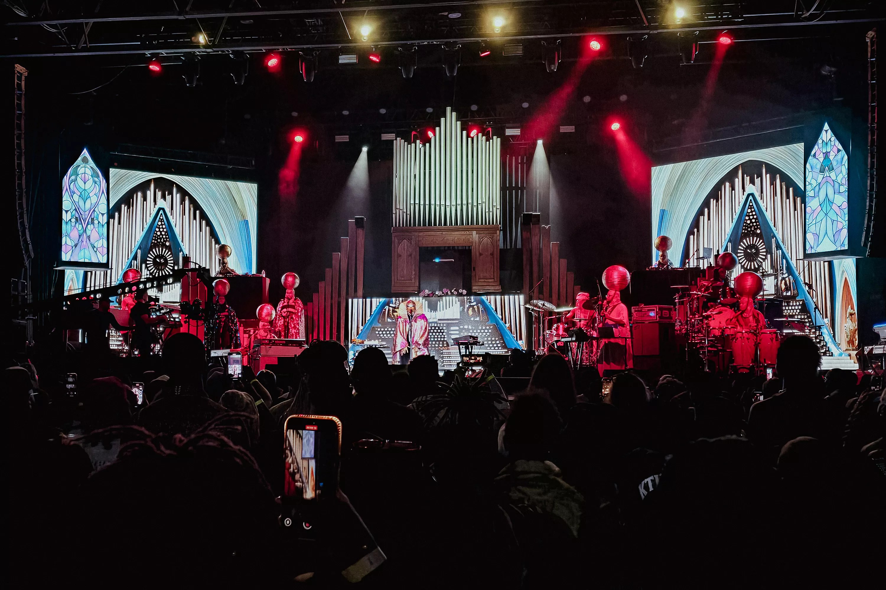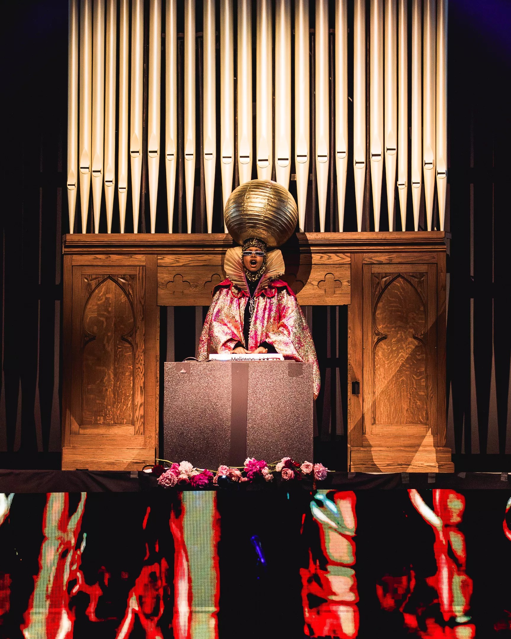 As if in a journey from the past, present and now to the post-emancipation future, a beep began to fill the air. Two stained-glass chapel windows aligned both sides of the stage, as a large pipe organ came into view. Otherworldly sounds enveloped the air as band members appeared one by one in futuristic-inspired apparel and headpieces, staying true to Badu’s fashion.