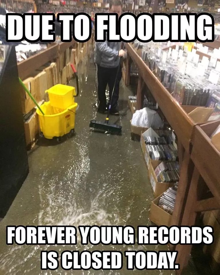 Last Sunday night, a local institution for music lovers took a massive hit as high winds and rain battered the area. Grand Prairie’s Forever Young Records lost a layer of its roof – designed to be rain-proof – in the storm, which caused the building to flood and resulted in significant damage to the store’s 11,000 square feet of vinyl and CDs.