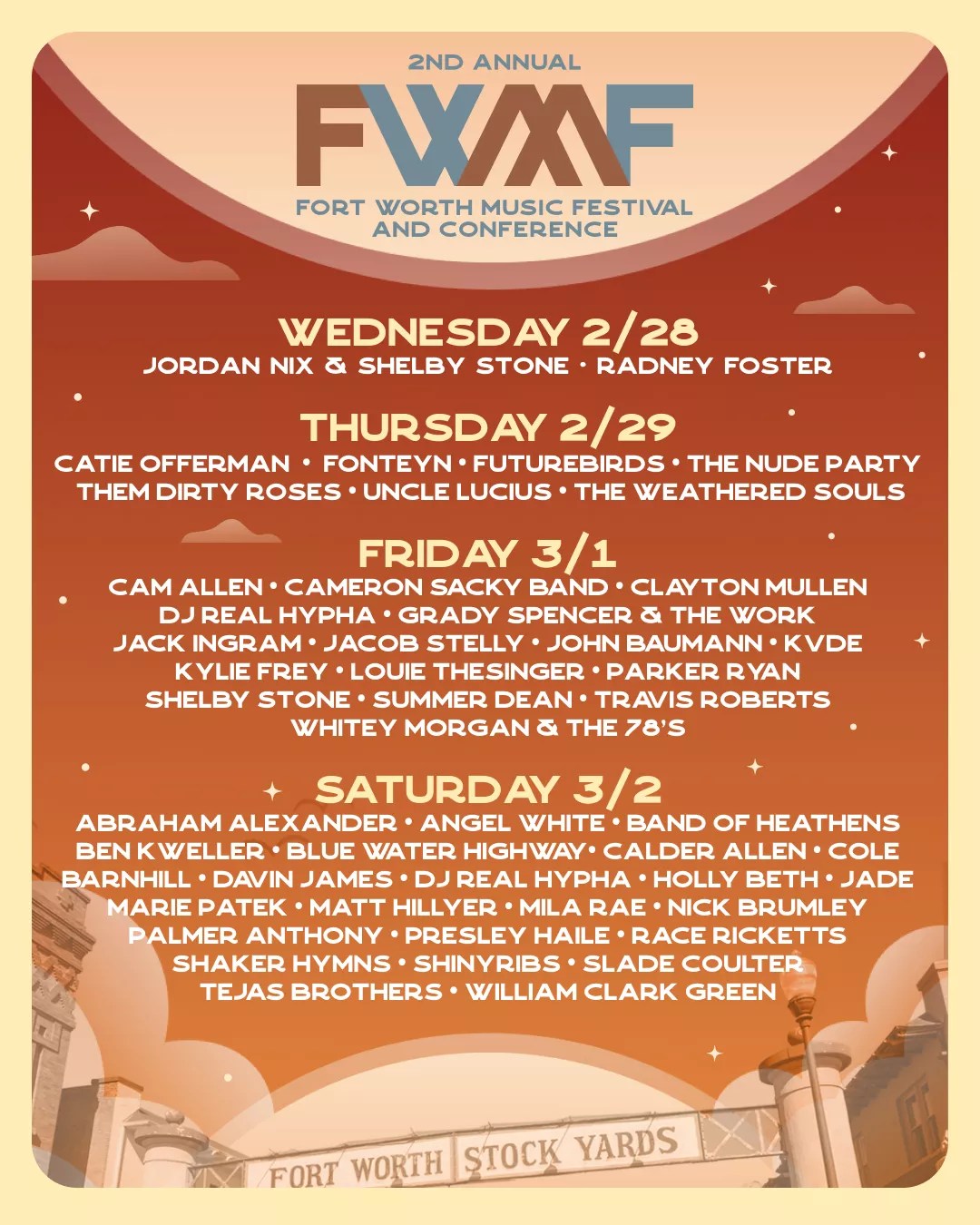 The Fort Worth Music Festival and Conference, a four-day music festival and industry networking event, is returning to the Stockyards for its second year, from Feb. 28 through March 2. The event will take place in multiple venues in the historic district and will offer panel discussions, keynote speakers and, of course, live performances from artists such as Abraham Alexander, Angel White, Louie Thesinger and many more.