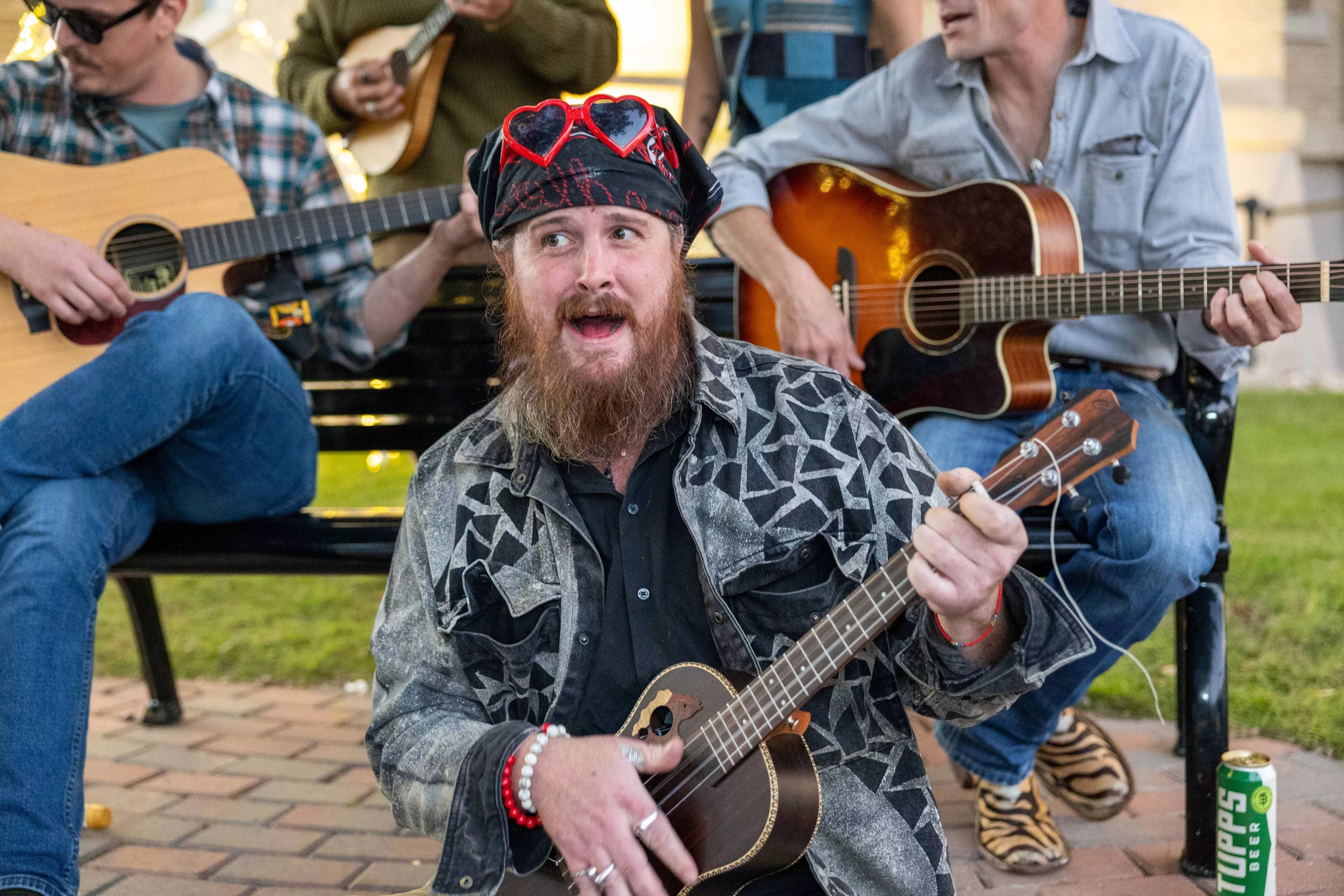 “How would you like to hear the greatest love song you’re ever gonna hear?” he asks, his legs crisscrossed, exposing dirty bare feet. He strums a ukulele plugged into a small amplification device hidden in the instrument’s case.