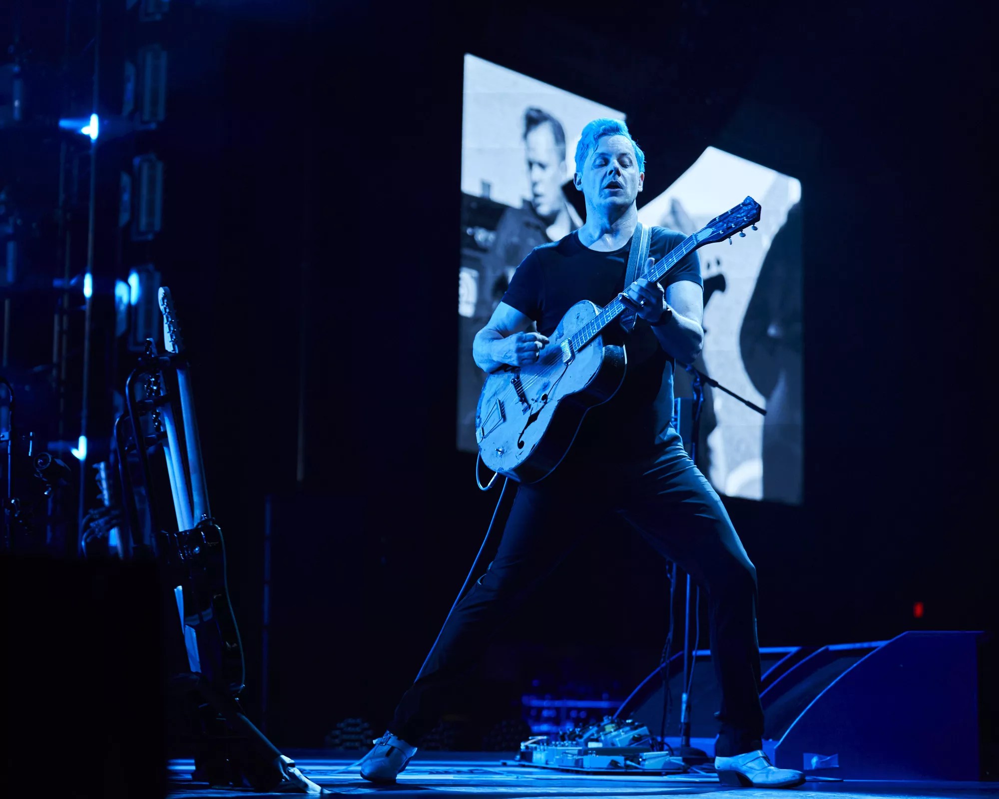 He wrung keening, snarling notes from the neck of his blue-accented guitars, playing high and low, the intensity of focus always evident in the black and white close-ups populating the screens on either side and behind the musicians.