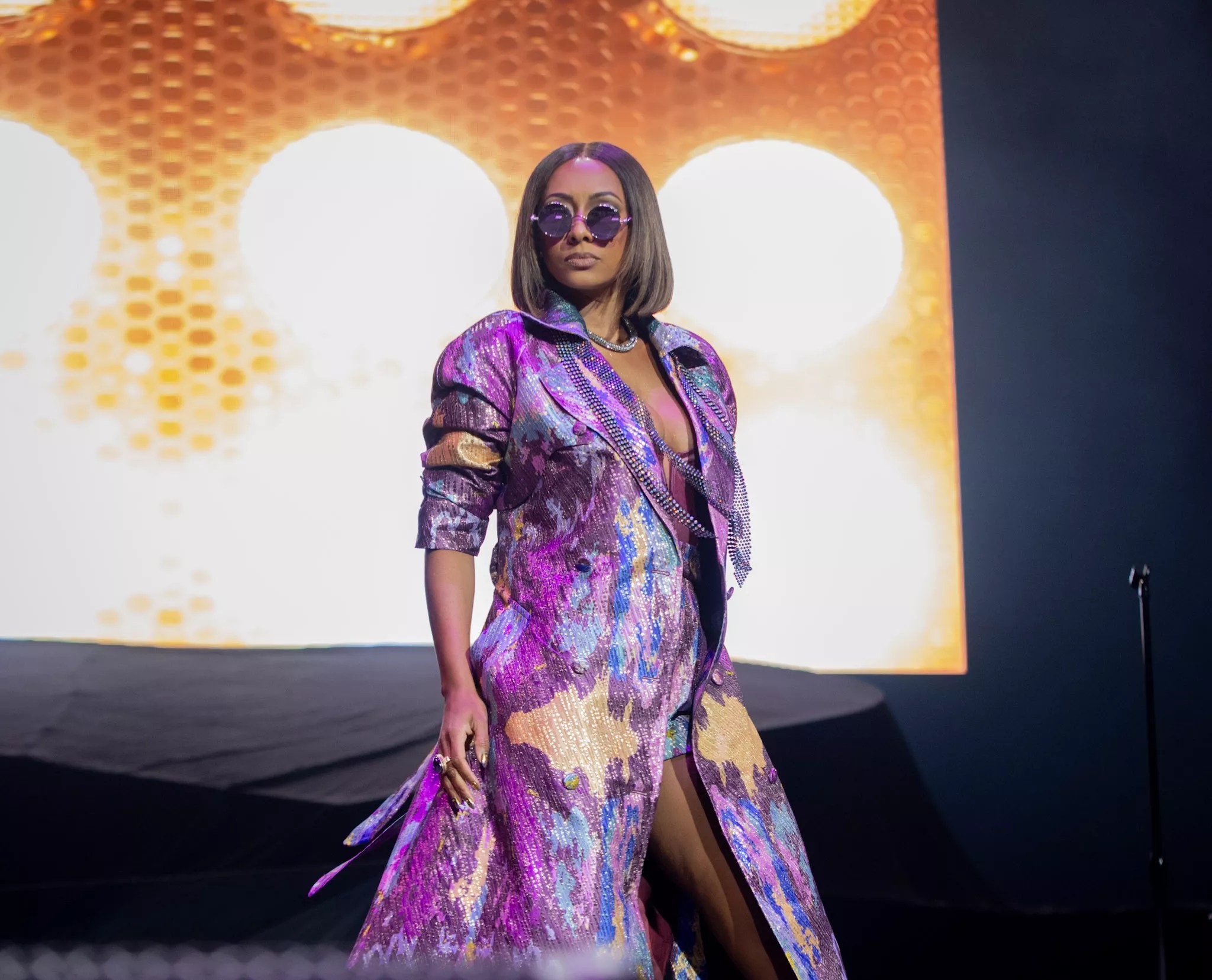 Next up was Keri Hilson, who burst onto the stage to her classic tune “Turnin Me On” and immediately had the arena buzzing. She was decked out in a vibrant ensemble: a long, multicolored jacket with matching shorts and a top, finished with shiny boots. Launching into “Get Your Money Up,” she built the energy even higher before dropping into “Knock You Down,” at which point the crowd erupted, singing along. The Atlanta native transitioned to her “Slow Dance,” sensually dancing with her microphone stand before turning cheeky during “One Night Stand,” where she invited a male from the audience near the stage and serenaded him. She smoothly shifted gears to perform her new song, “Bae,” from her third album, We Need to Talk: Love, then delved into deeper cuts for her longtime fans. When the first notes of her final song, “Pretty Girl Rock,” rang out, the entire arena rose as one, singing every word.