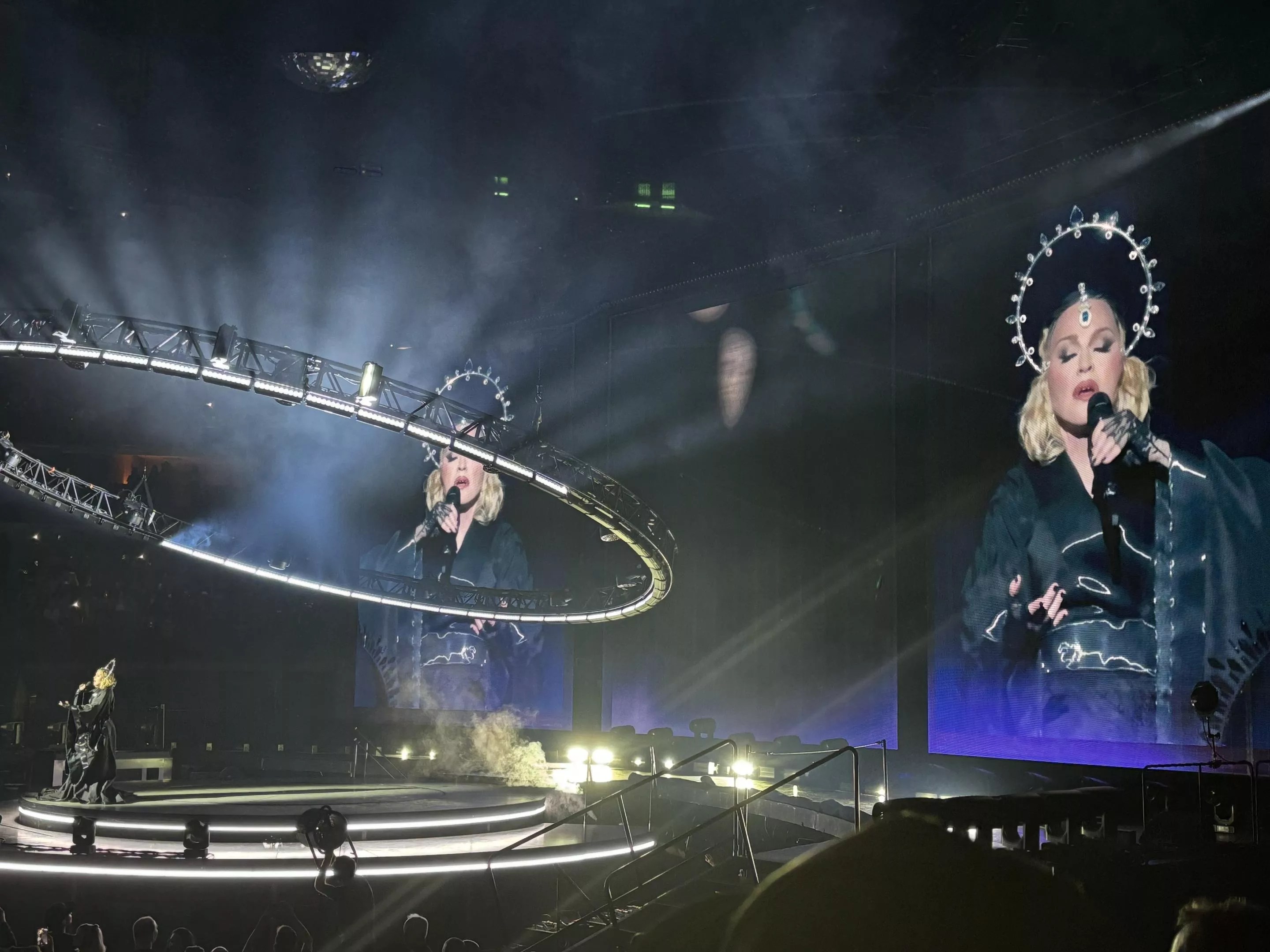 A sound of tolling bells then came from behind the screen. A circle of crosses rotated with dancers in each compartment, hanging at times as if crucified. Madonna walked around the stage’s ramp with her head covered, along with dancers dressed as priests. The intro to the Sam Smith/Kim Petras hit “Unholy” lead to “Like a Prayer” as the stage’s floor lit up as if on fire.