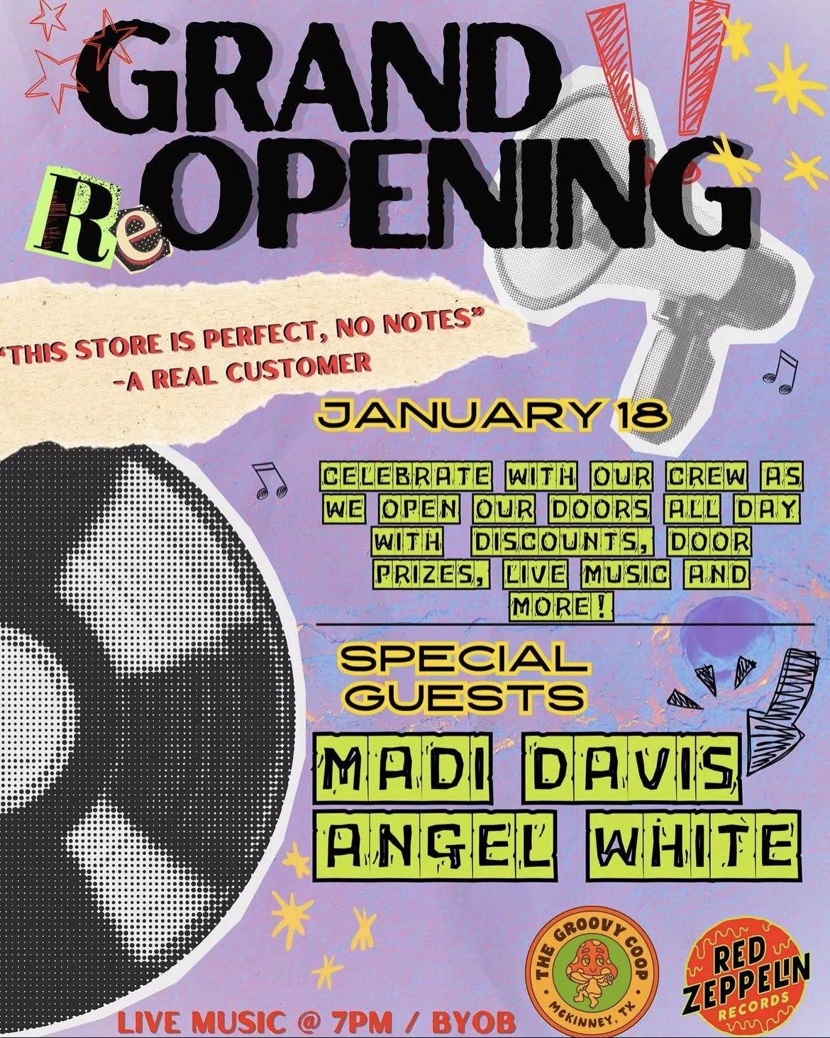 Davis is set to take the stage at 7 p.m. for a 45-minute set, followed by White for an hour. Both Red Zeppelin and The Groovy Coop will offer discounts of 15% all day, along with door prizes including merchandise and gift cards. The store opens at 10 a.m.