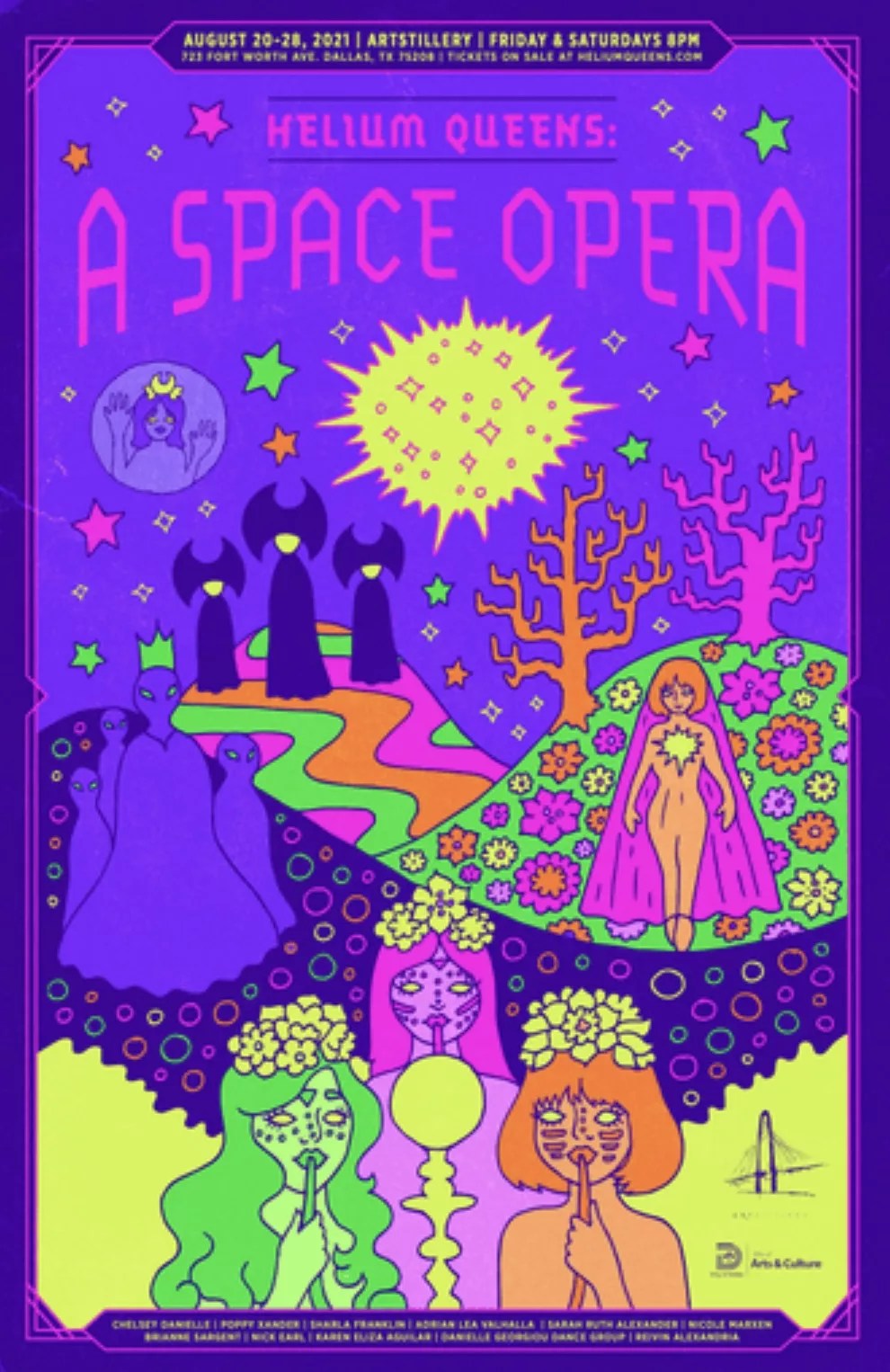Today, women like Morales are thriving across Dallas’ nightclubs and venues, with female artists and promoters embracing what was formerly a male-dominated industry. Morales’ Helium Queens poster from 2021. Claire Morales