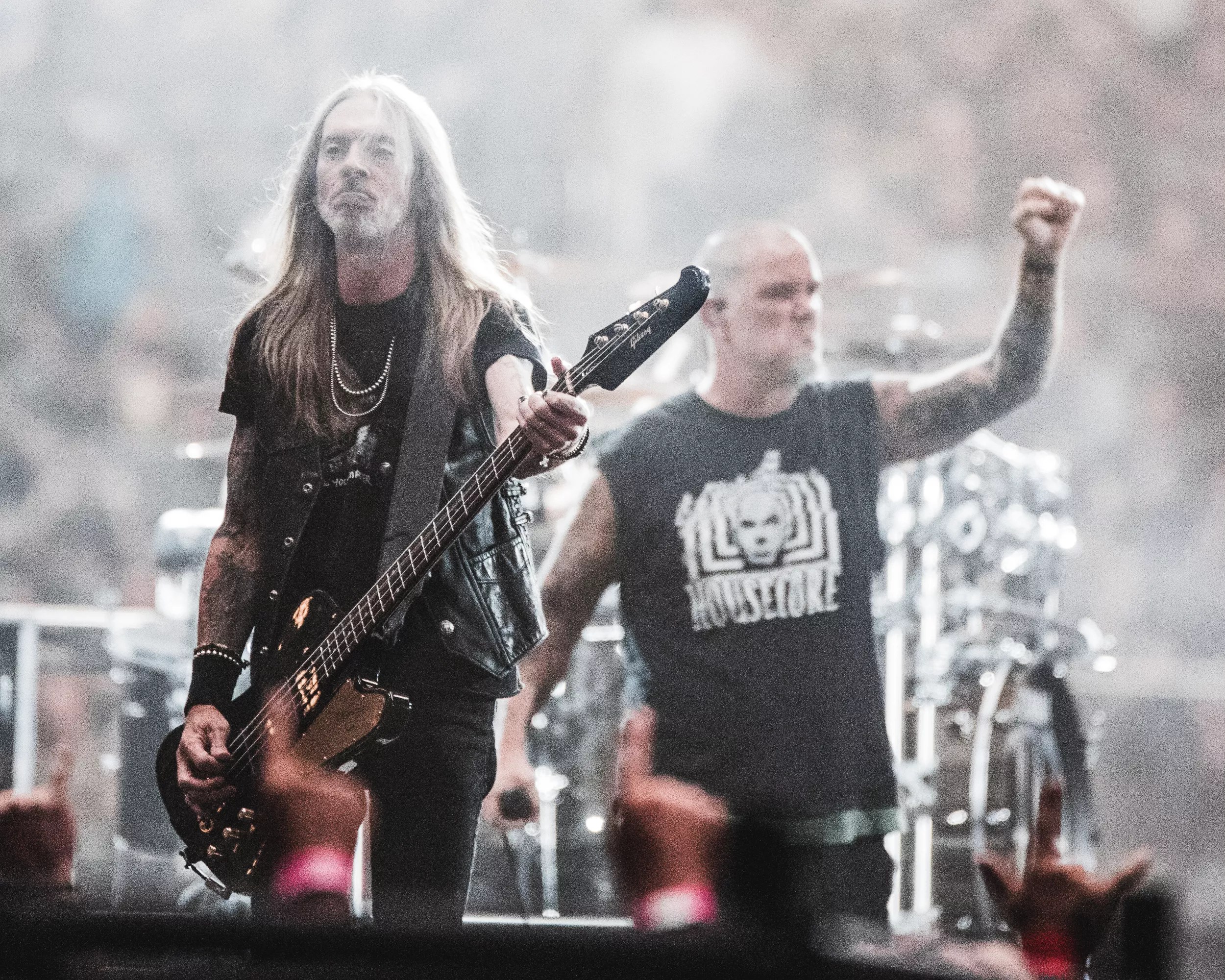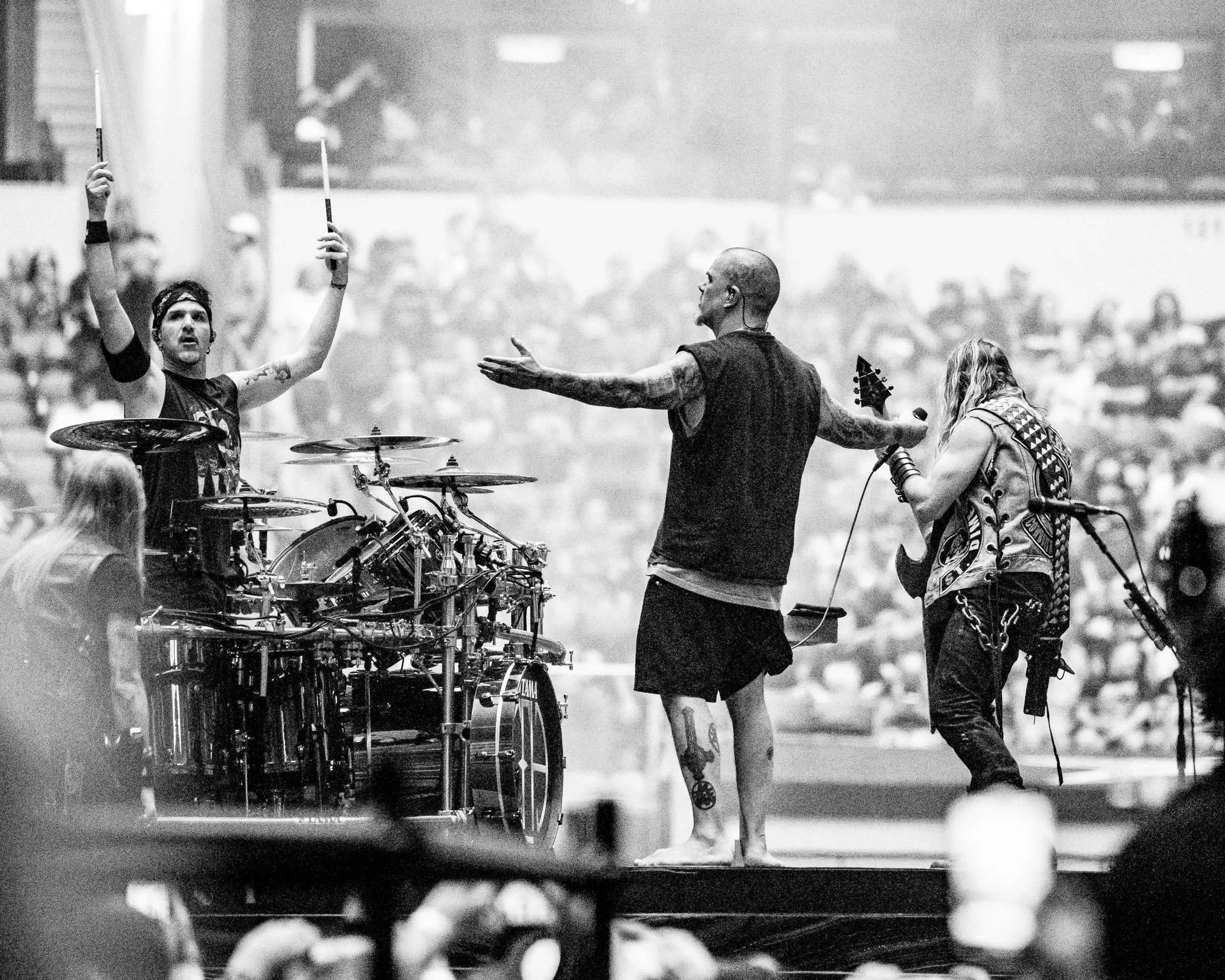 Wylde’s guitar, an homage to Darrell’s signature guitar, was complemented by Darrell and Paul’s faces on Benante’s kick drums. Anselmo dedicated “Strength Beyond Strength” to their memory. Wylde would switch to his own signature guitar later in the set among many others.