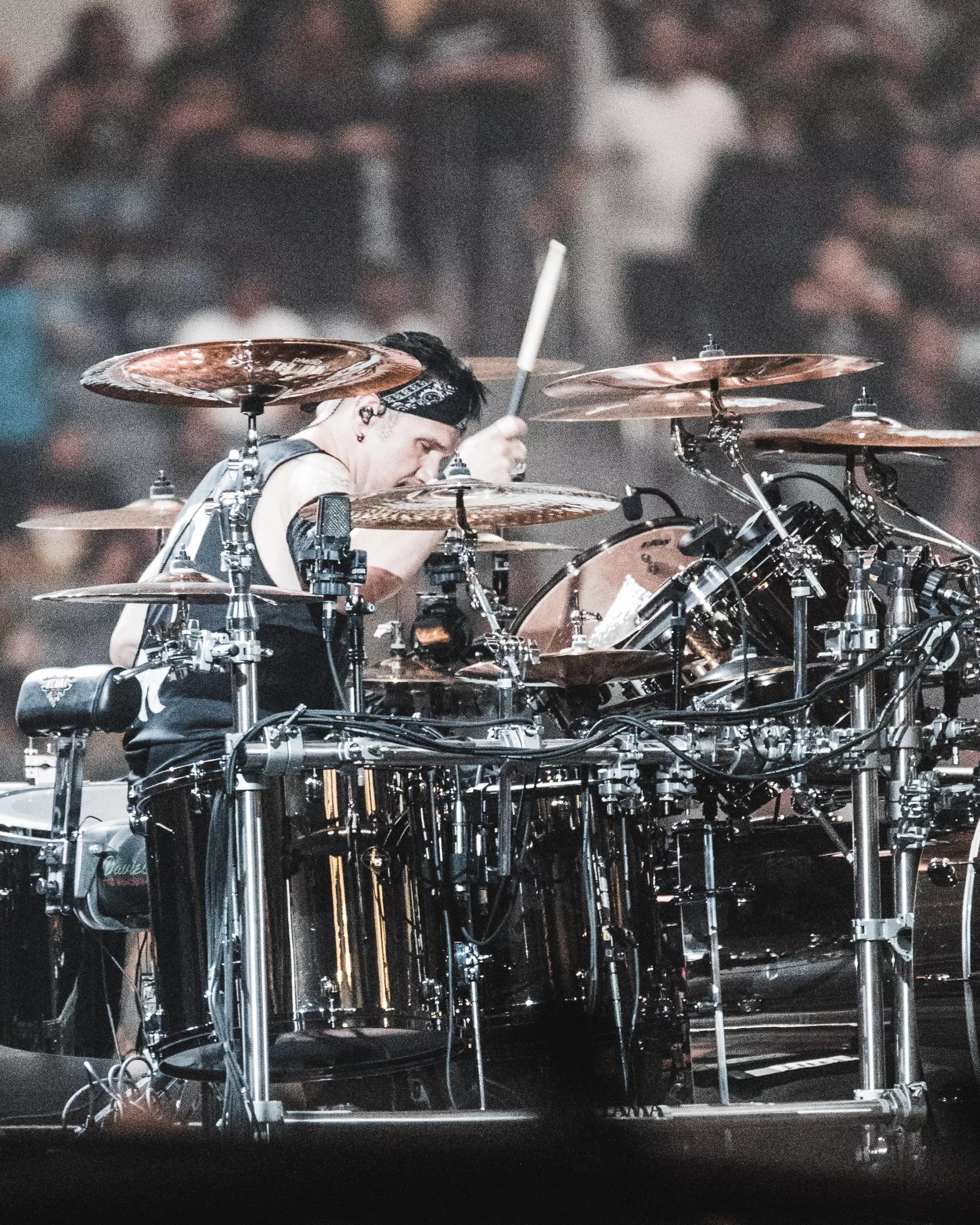While Hetfield, Trujillo and lead guitarist Kirk Hammett roamed the stage with remote amplification, Lars stayed seated in a drum kit that would move between songs to face different parts of the audience.