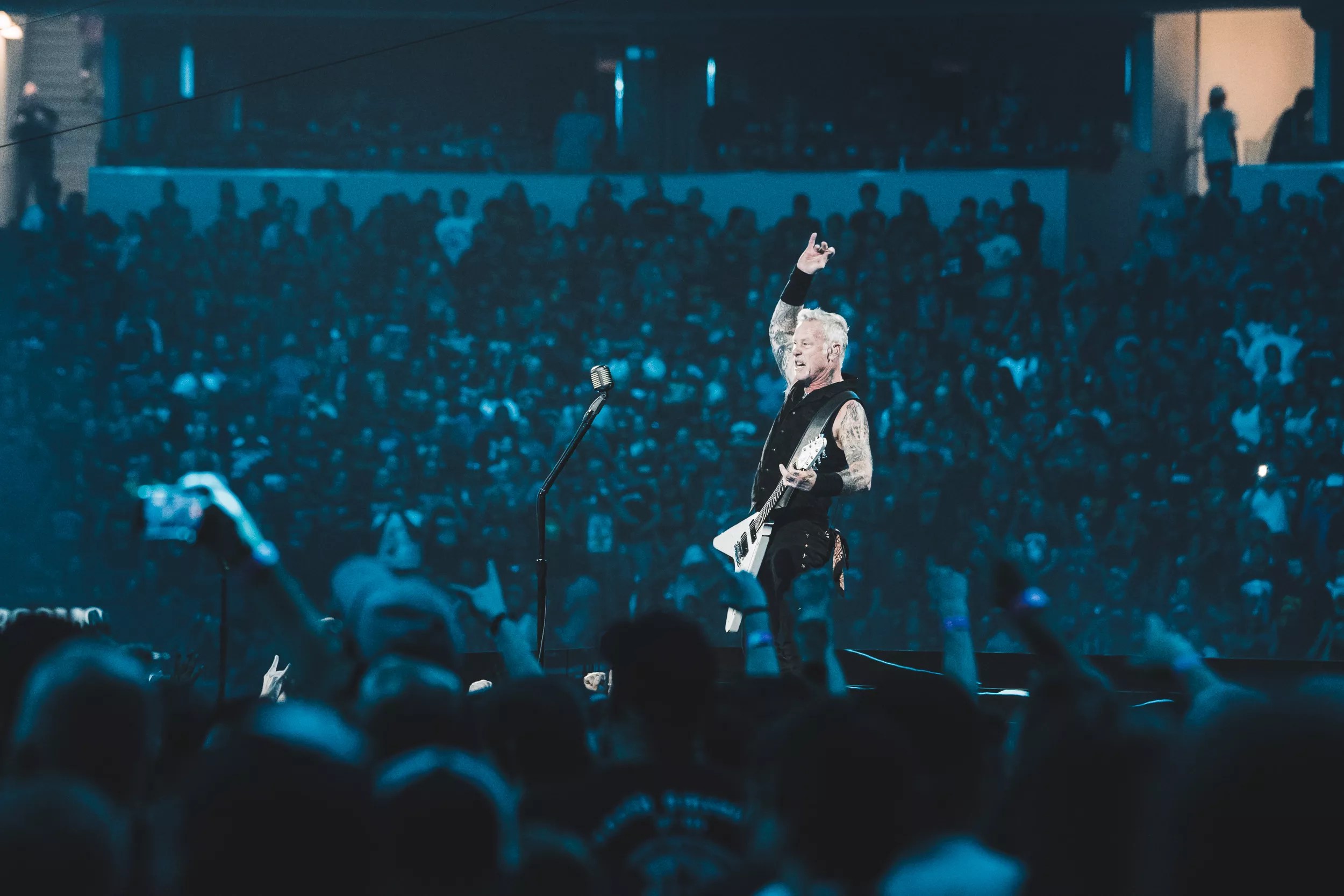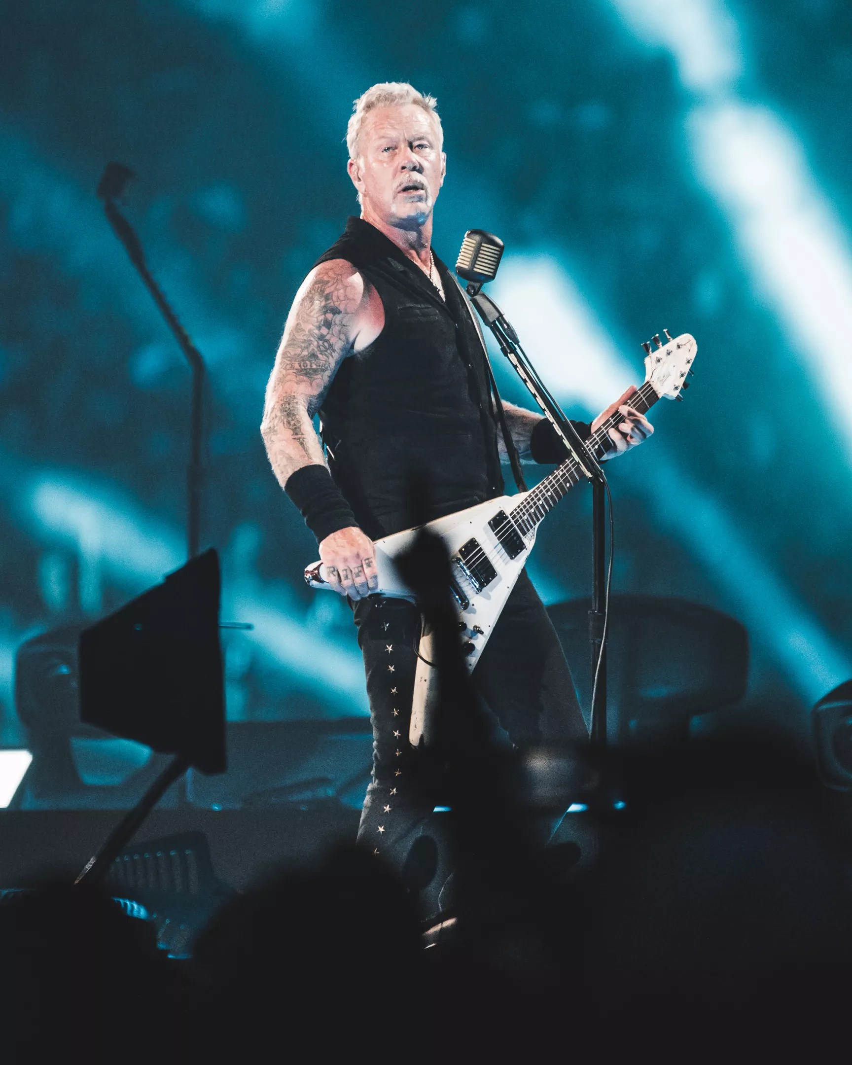 After a blackout, the stadium was split between purple and aqua light, Hetfield now facing west, and slowly singing the opening of “Welcome Home (Sanitarium).”