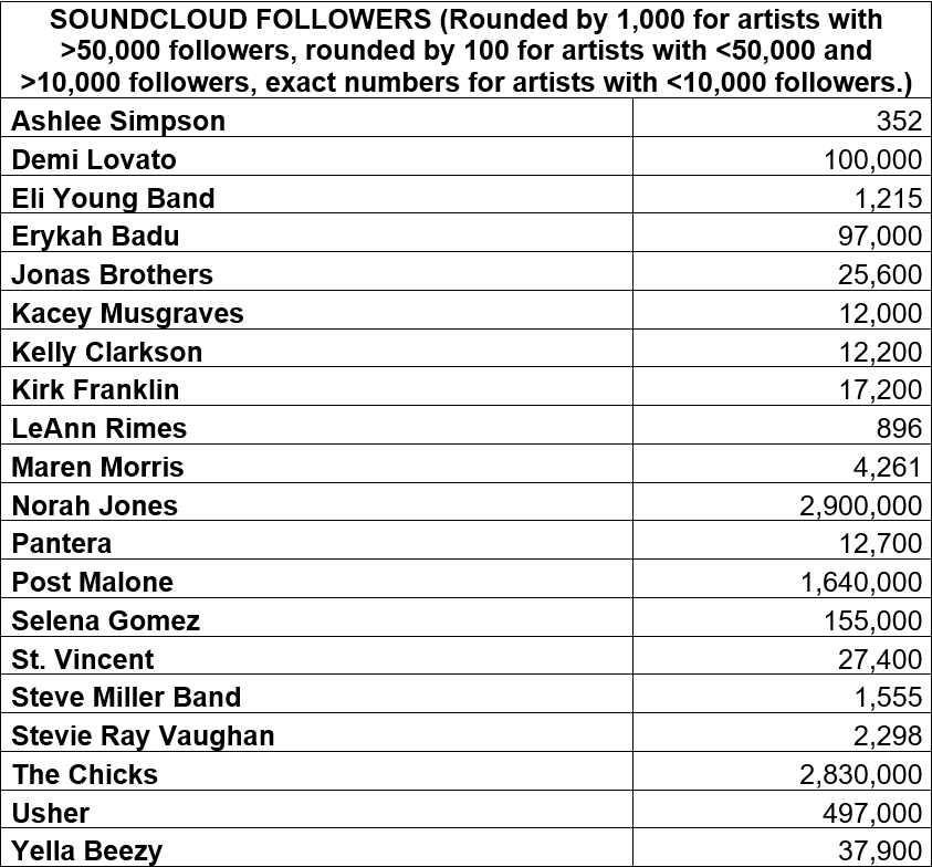 Predictably, many of the less-current artists on this list have abysmal numbers on SoundCloud, but Soundcharts still sees fit to include the streaming platform in its reports: