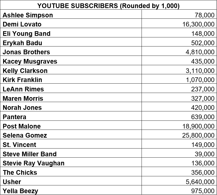 Below is a list of all 20 artists and the number of their YouTube subscribers:
