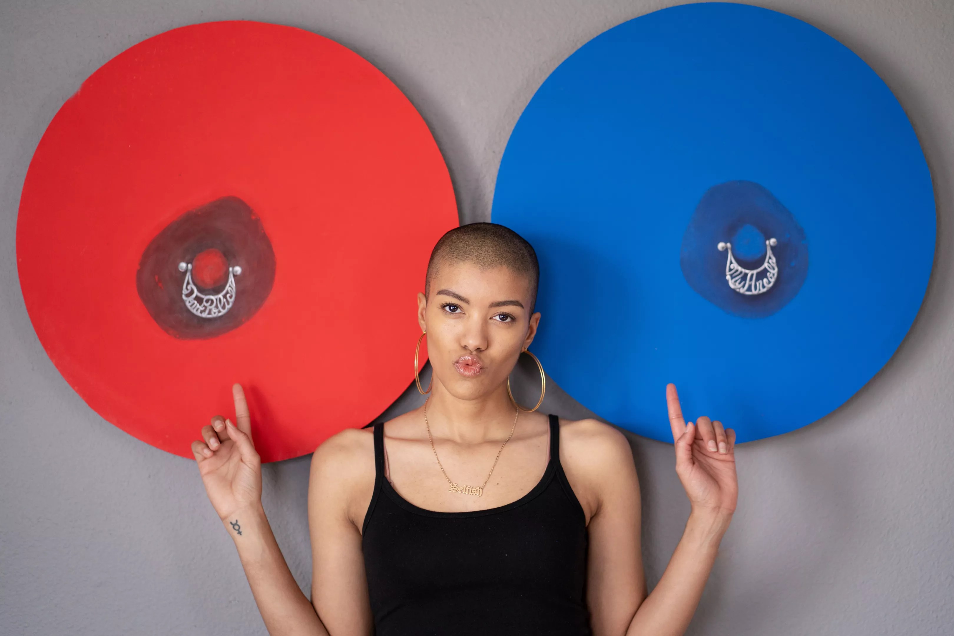 She’s also homed in on a personal aesthetic with a series of nipple paintings that are prominently featured on her Instagram page, @thesamlao. “The nipple paintings were inspired by a lyric from my song, ‘Pineapple,’ that says: ‘Don’t police my areola,'” Lao explains, referencing the #freethenipple movement. “And, I’ve recently begun work on a new series of paintings that combine my love of painting with typography and textiles.”