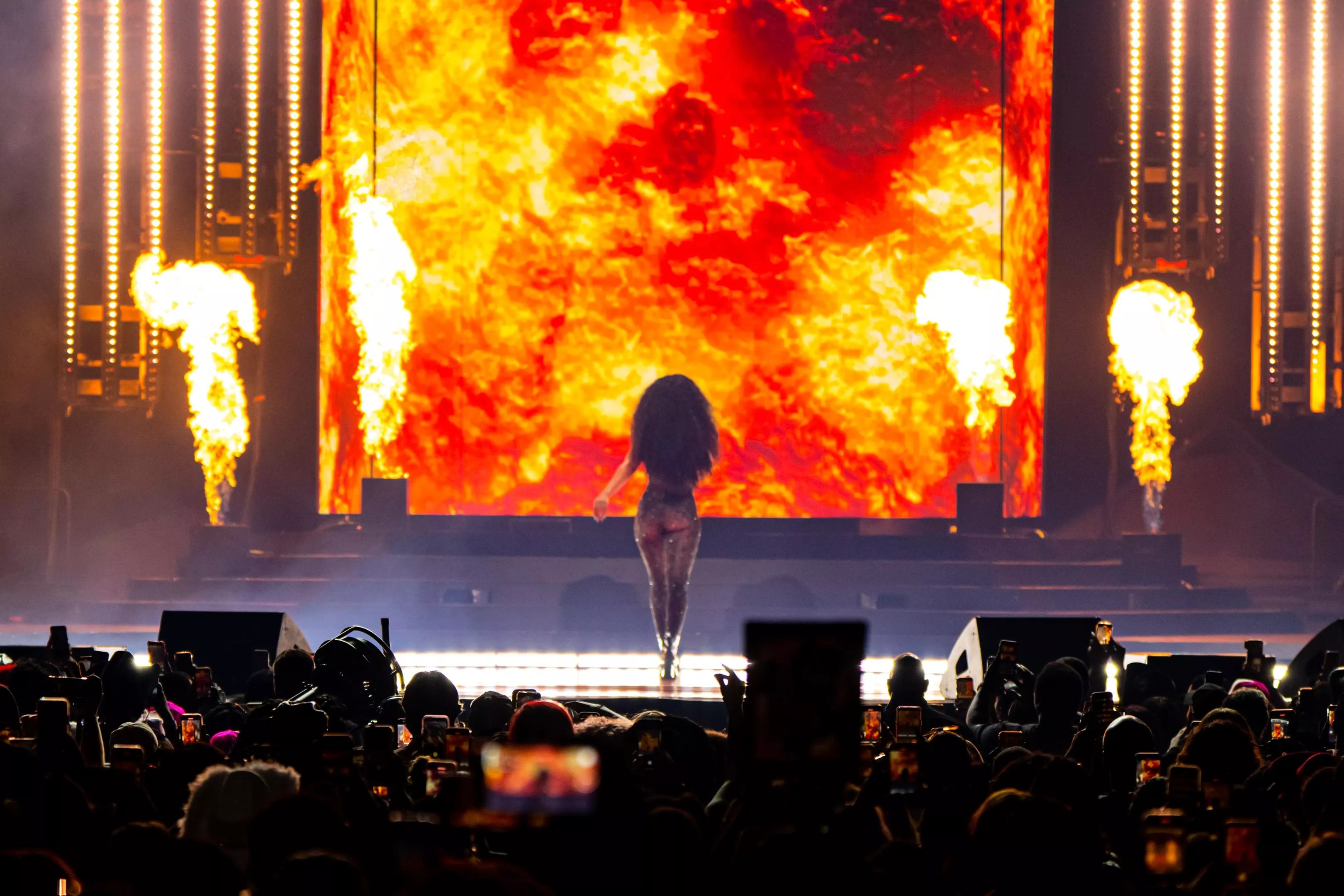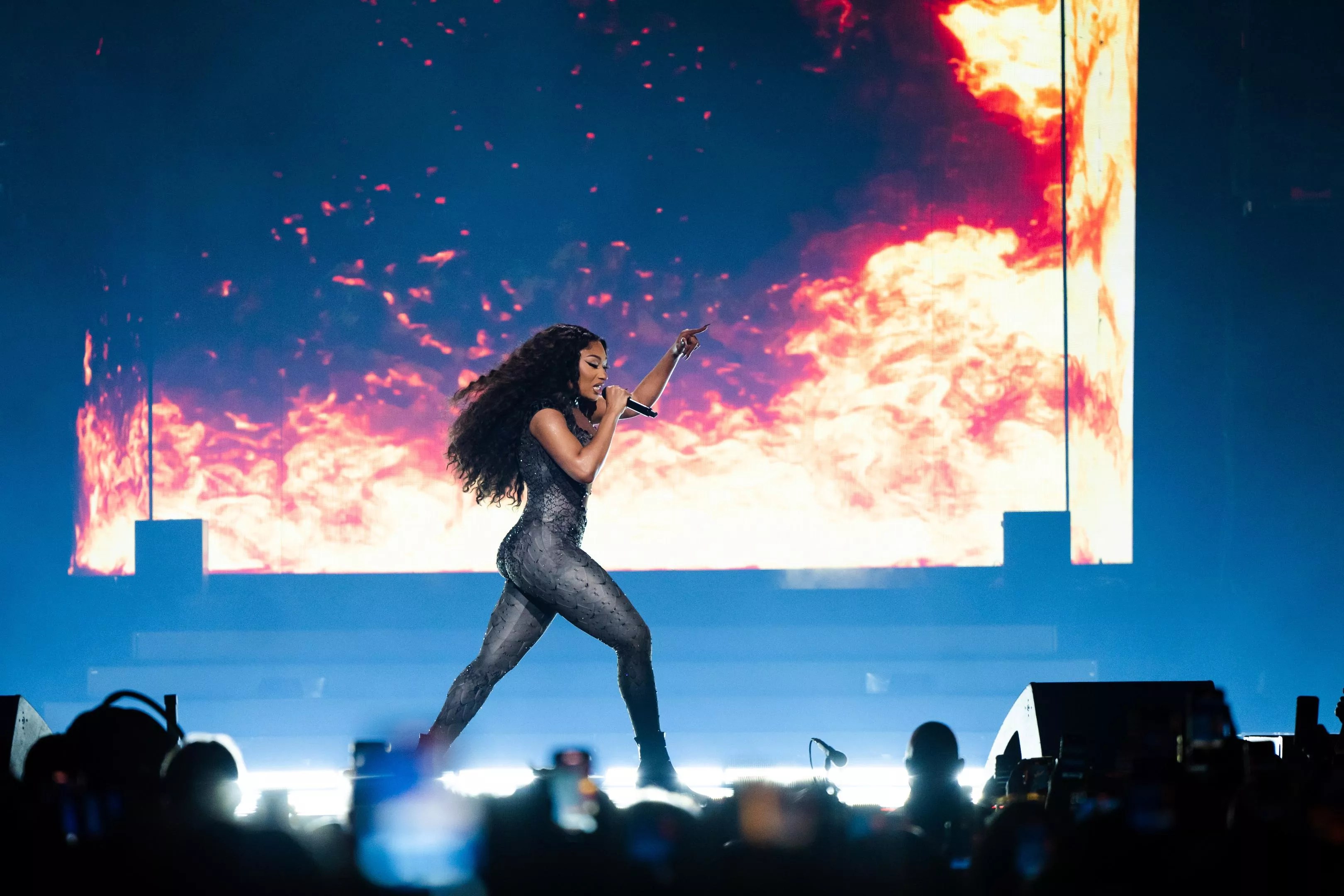 “HISS,” which spits venom at everyone who tried to knock her down in the aftermath of the Tory Lanez shooting, was performed alongside pyrotechnics and flame animations flickering up and down the LED screens. It’s the perfect song to start with. Standing tall as an independent artist in front of 20,000 fans is an undeniable victory, but she’s still earned the right to kick the haters while they’re down.