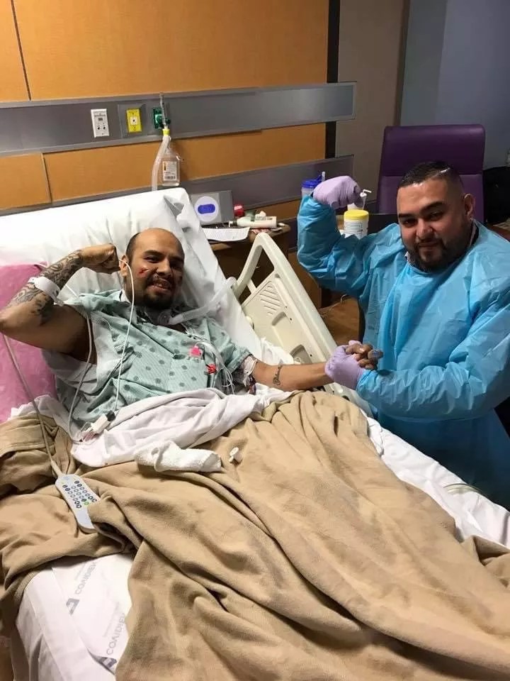 GSpook (left) gets a visit from friend George Redd Speaks (right) during the Dallas DJ’s hospital visit in 2017.