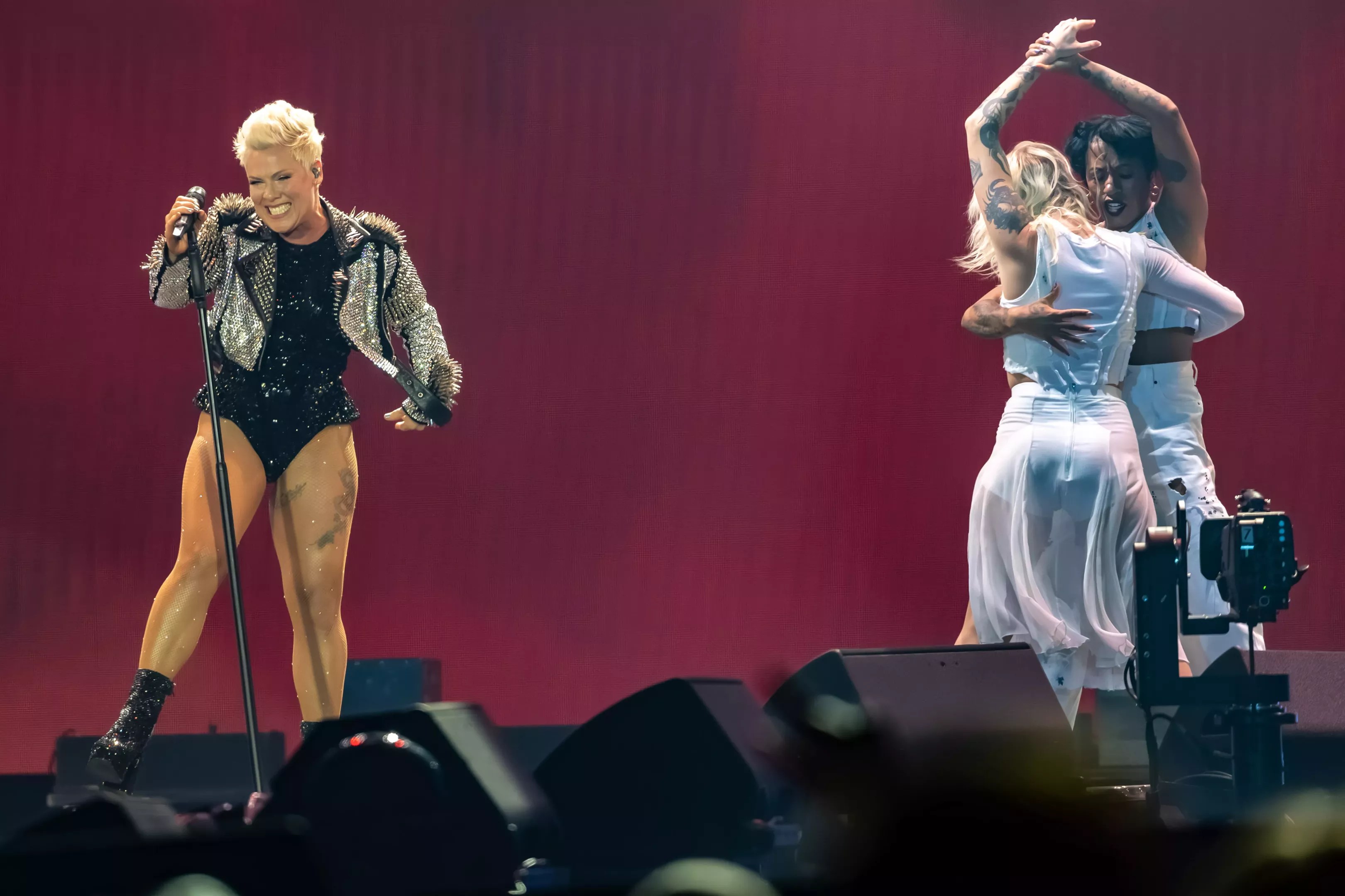 Seeing the interplay between Pink and her trio of backing vocalists as they sing an acapella intro to “Please Don’t Leave Me” adds depth and potency to all the sensory overload, giving it a more meaningful heft.