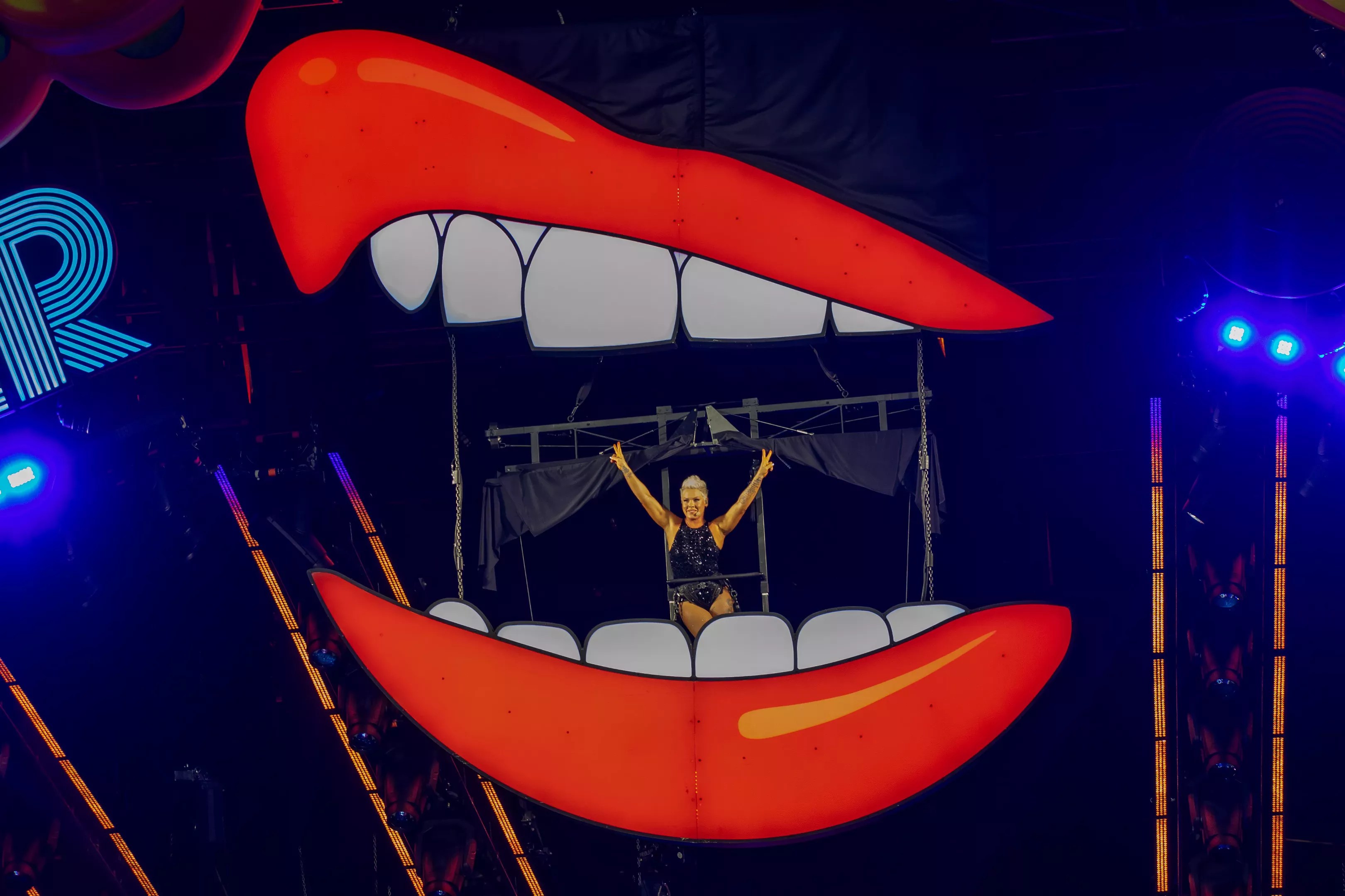 What was true a decade ago is no less true now: Pink is one of one in the world of pop music performers. As “Get The Party Started” roared to life before an estimated audience of 65,000 (seemingly filling every available corner of the stadium), Pink began the night strapped into a harness a couple hundred feet above the stage, before ever-so-casually launching herself into thin air, spinning and turning and singing as she made her descent.