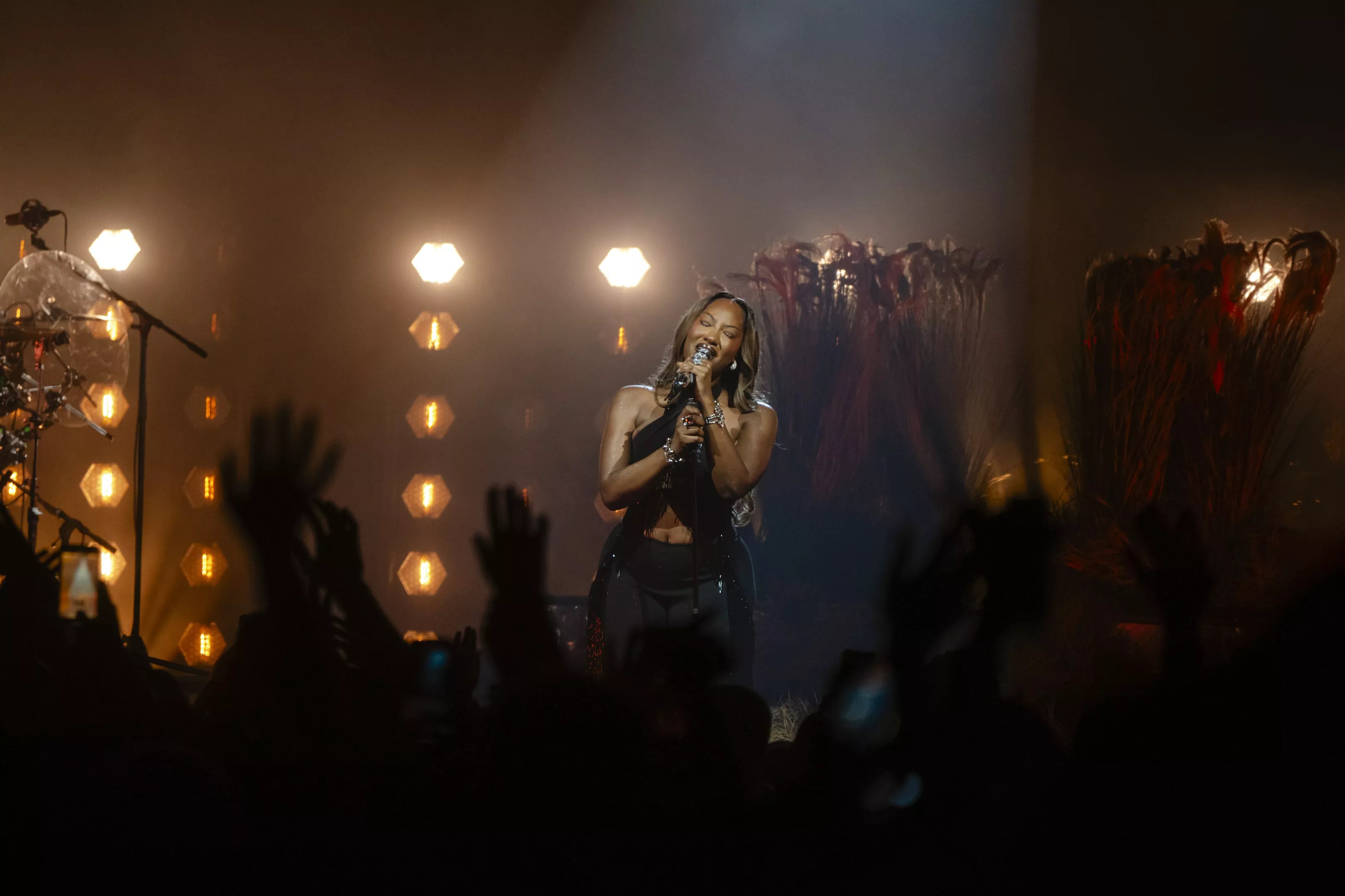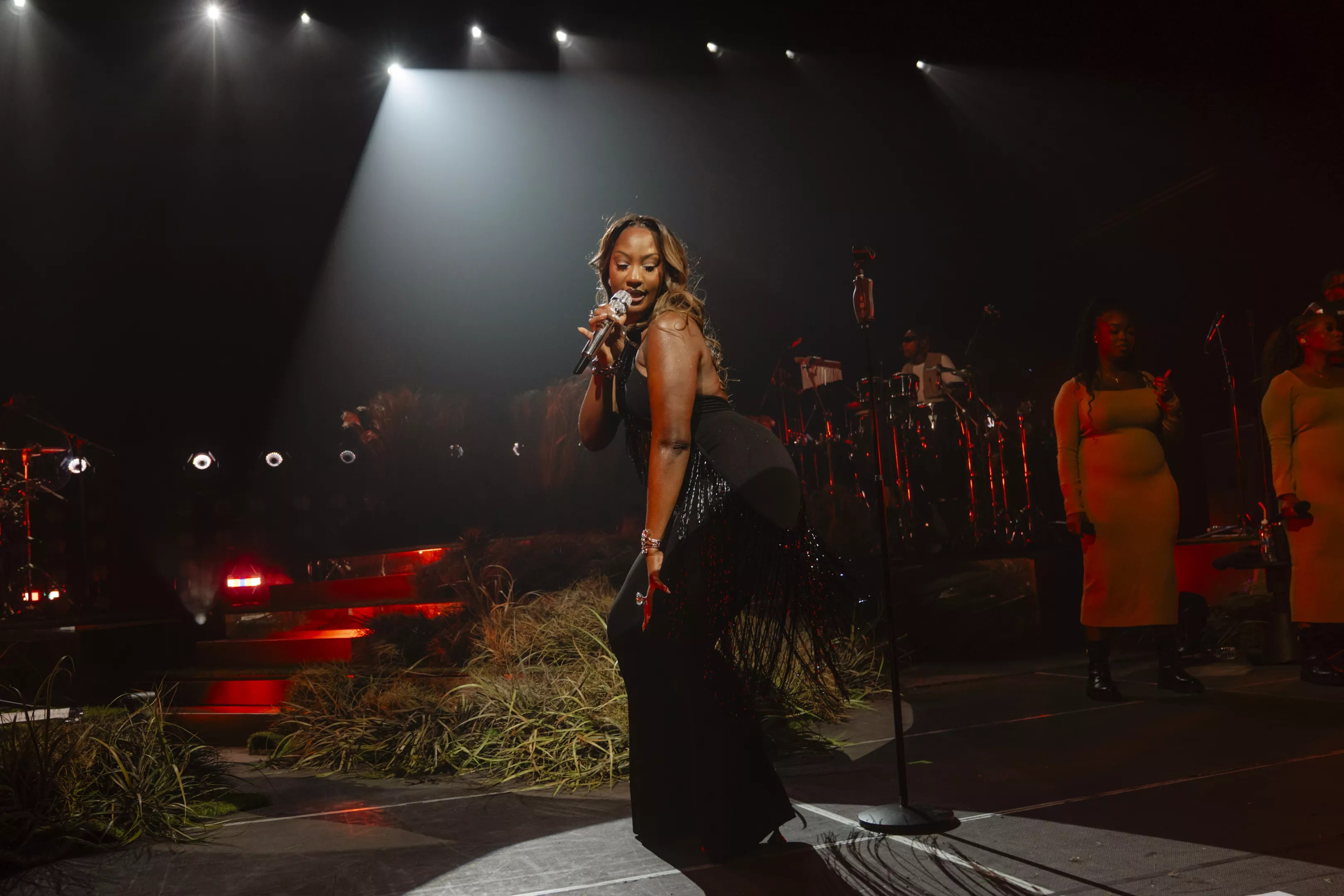 Between sets, the stage transformed into a grassland before Tems emerged wearing a bejeweled black halter top and matching pants. She opened the set with “Crazy Tings” from her 2021 EP If Orange Was a Place, which earned an immediate reaction. The hypnotic percussion loops from her backing band got the grooves rolling, as the singer seamlessly charged through her catalog.
