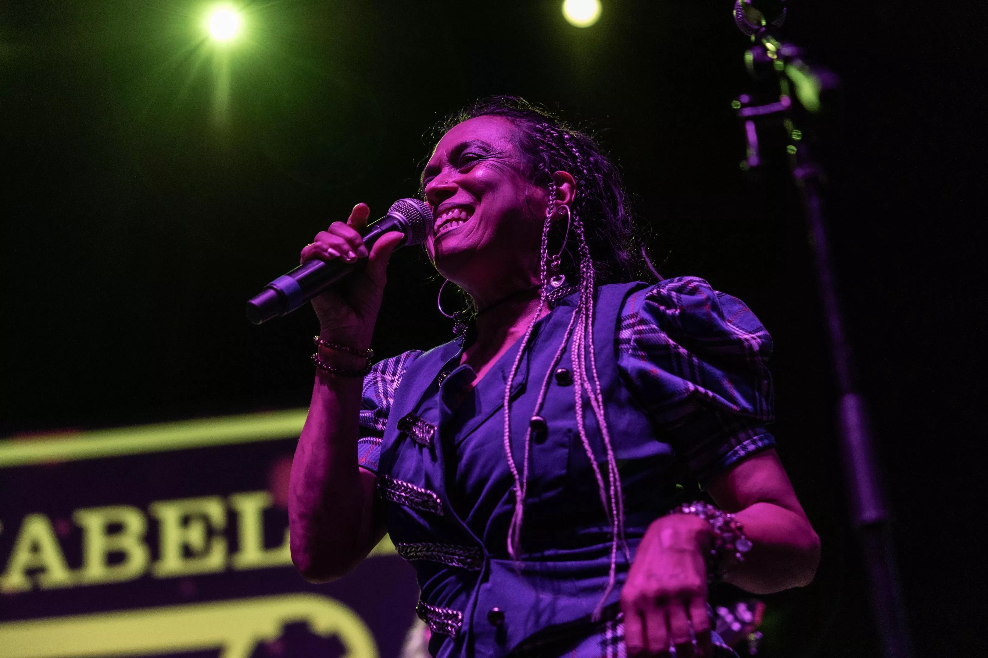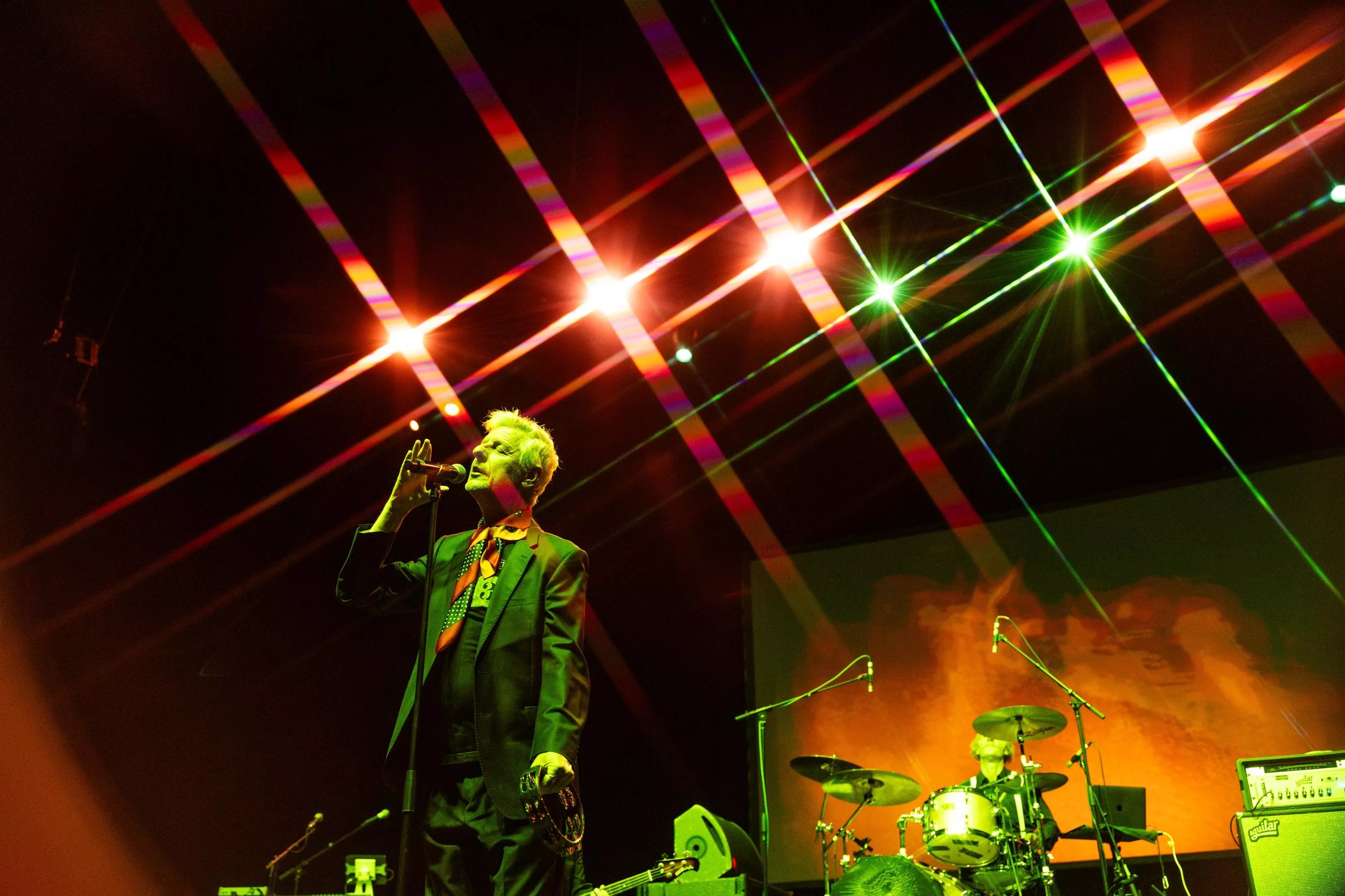 The singer wore a wireless mic and drifted across the stage, ocasionaly banging a drum, strolling to the keyboard for a solo or posing with other band members.