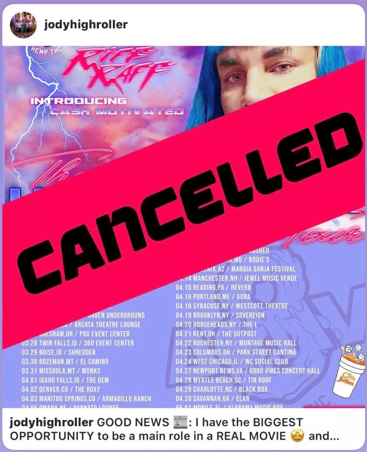 The rapper who’s also known as Jody Highroller announced he would have to cancel his Lilac Lightning tour just two days before the first date of the show scheduled at Ruins’ Limbo Room in Deep Ellum on Wednesday, according to Riff Raff’s social media channels.