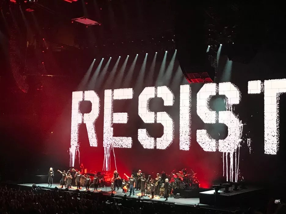 During “Another Brick in the Wall,” a group of 10 schoolchildren dressed in orange prison jumpsuits danced with infectious glee before tearing open the suits to reveal black T-shirts emblazoned with the word “Resist.”