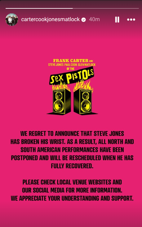 Just days away from their planned North and South American tour, seminal punk rock band the Sex Pistols have postponed all tour dates, citing a broken wrist from guitarist Steve Jones.