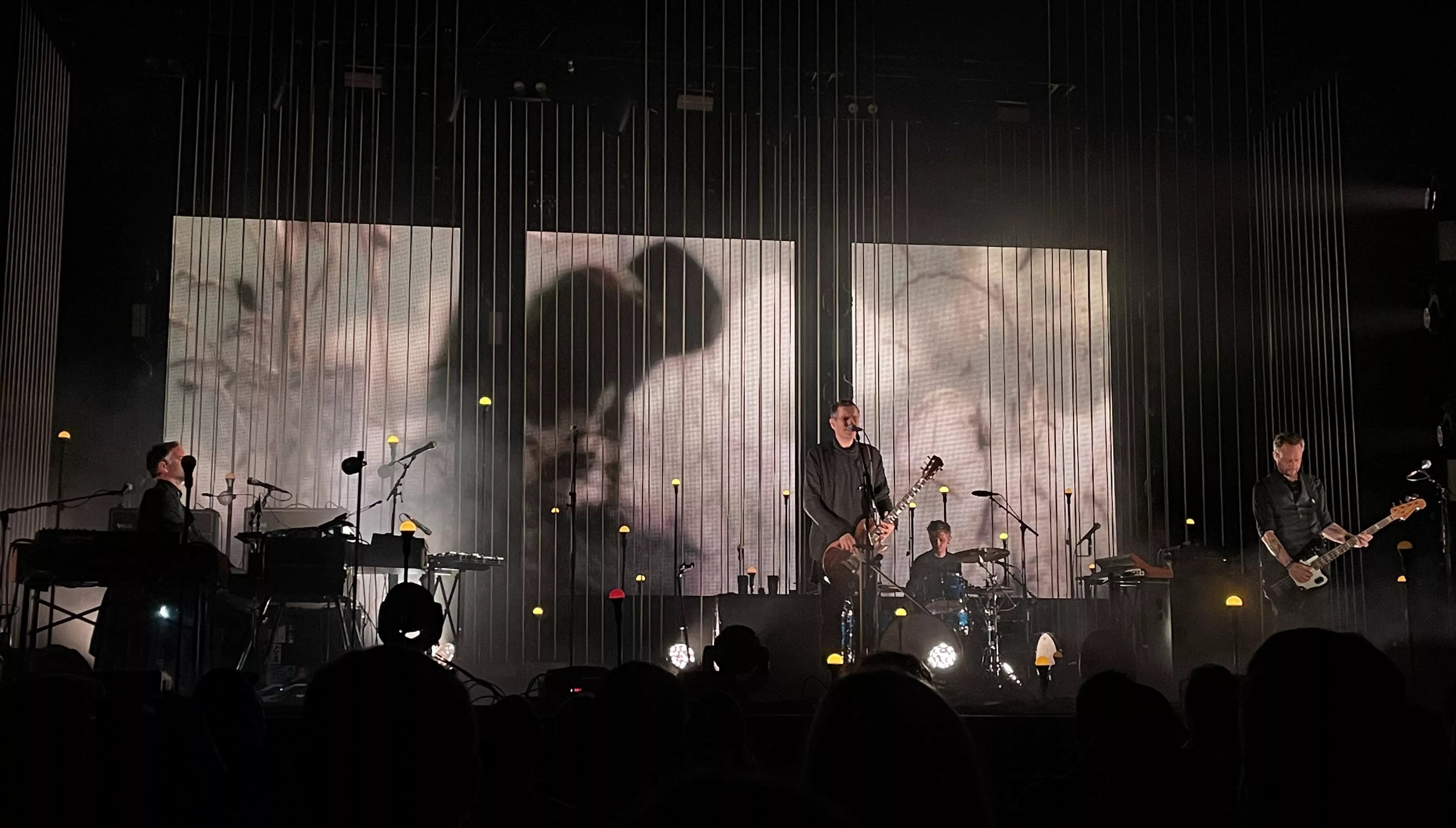 The four men were frequently shrouded in hazy shadows but just as often became distinctly clear amid naked, eye-watering blasts of light. They moved about the stage, surrounded by lightbulbs on poles that pulsed and glowed, and spoke very little over the course of more than two hours to the rapt, near-capacity audience gathered in front of them.