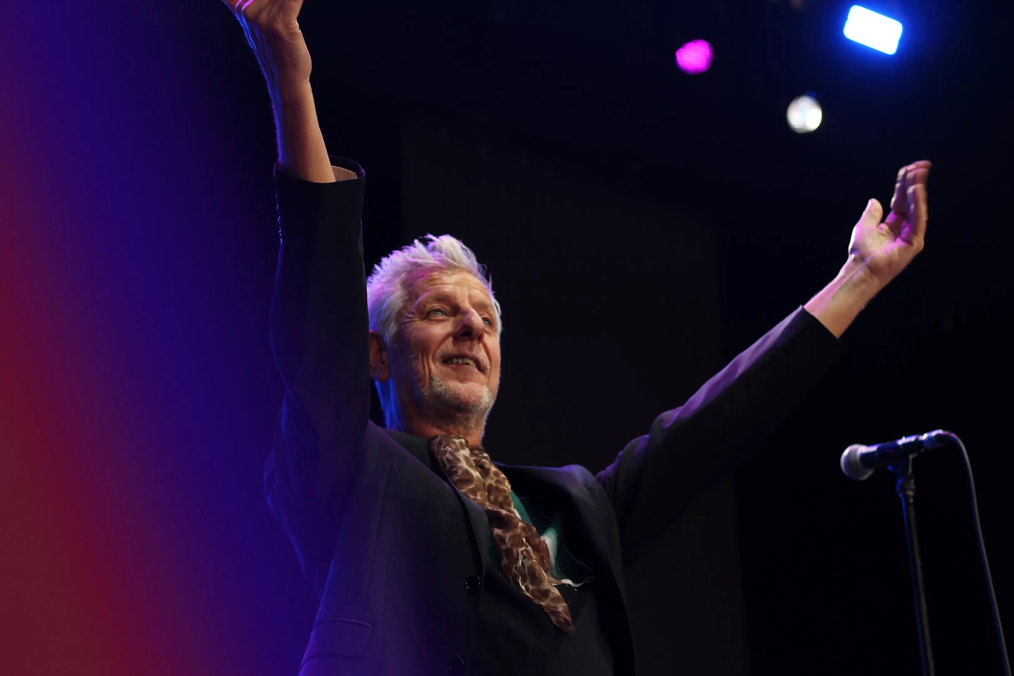 Robbie Grey of Modern English energizes the crowd with a tambourine in hand and a dynamic stage presence. Preston Barta Modern English’s Robbie Grey and guitarist deliver timeless post-punk vibes under the spotlight. Preston Barta Robbie Grey captivates the audience with his signature charm and raised arms, embodying the spirit of Modern English. Preston Barta