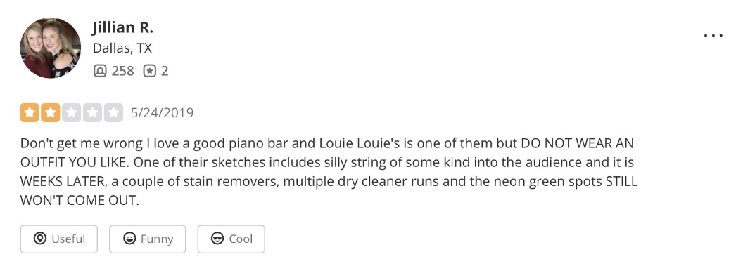 This Yelper seems to have unfortunately visited this Deep Ellum piano bar during some Nickelodeon Kids’ Choice Awards bit. Jillian R. warns those visiting Louie Louie’s Dueling Piano Bar not to dress in their favorite clothes, as she was sprayed by some neon green silly string during the show. Despite tireless efforts involving stain removers and dry cleaners, her attire is still hopelessly stained. Maybe the pianos duel with the customers when we’re not looking. We can’t be sure.