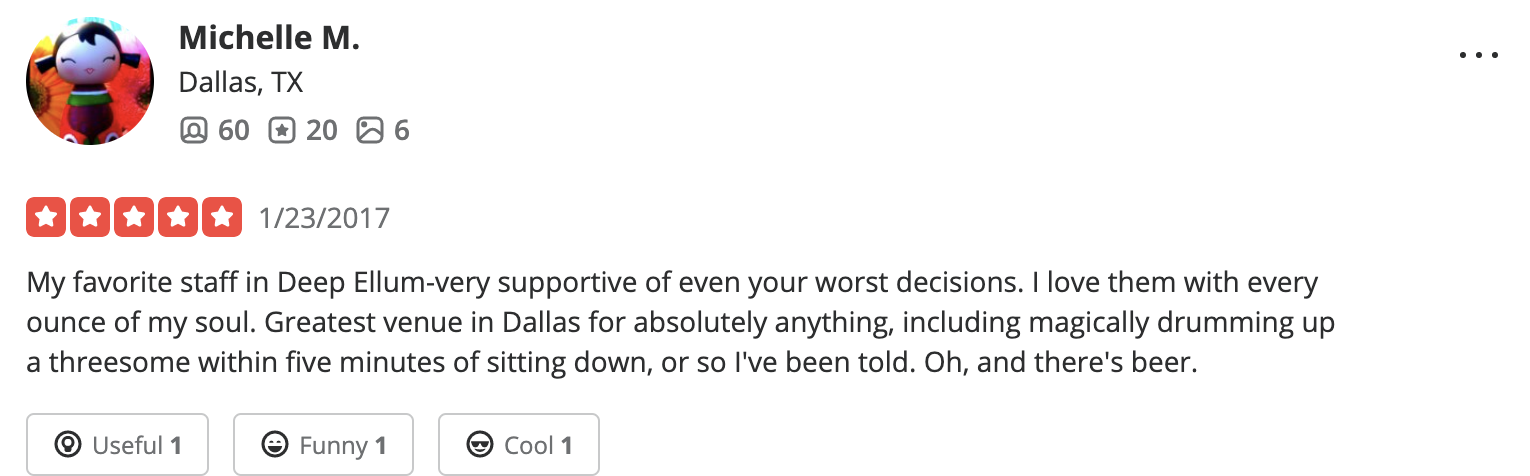 From wholesome to concerning to outright absurd, these are the Yelp reviews of Dallas bars and live music venues that made us stop scrolling.