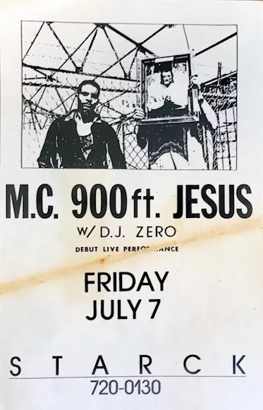 In the large box of Starck goodies, I found blue and yellow prize ribbons, letters from club regulars, party invitations, gig posters and fliers. I now own 15 mini-posters promoting the debut live performance of MC 900 Ft. Jesus with DJ Zero. MC is making a very nice comeback these days.