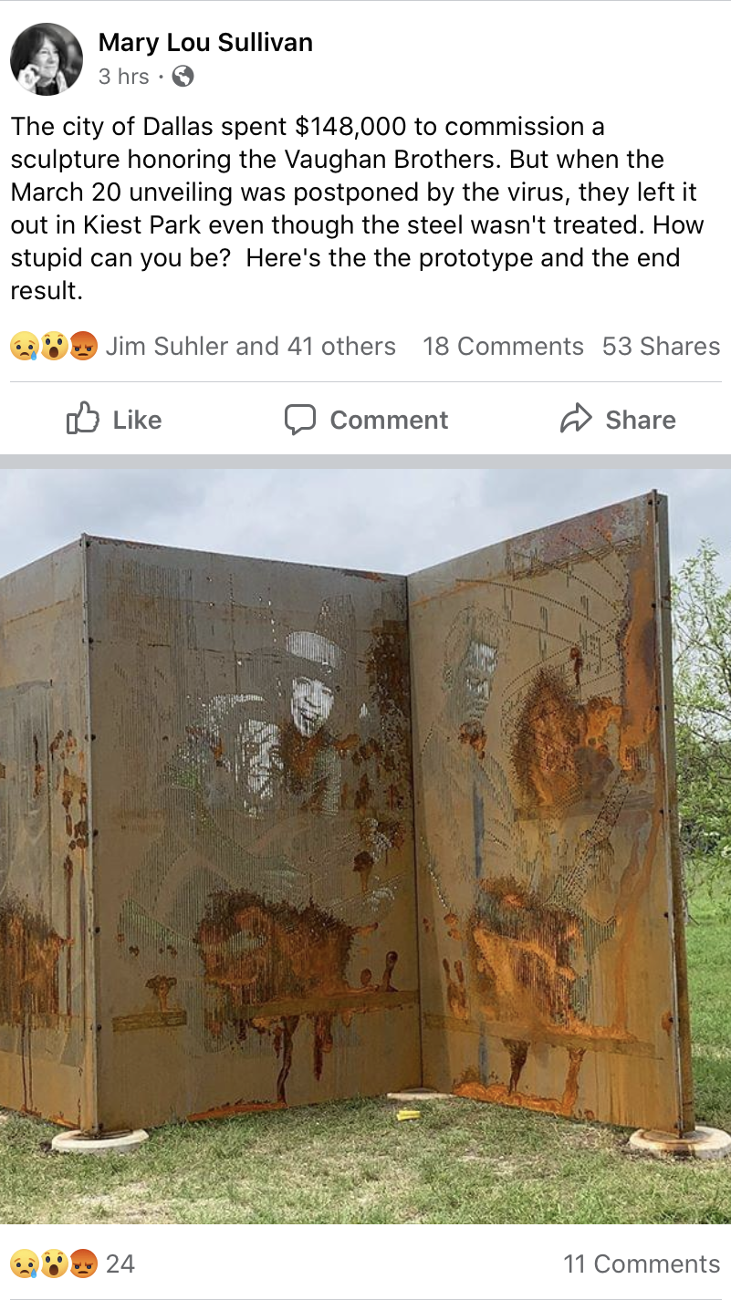 “The city of Dallas spent $148,000 to commission a sculpture honoring the Vaughan Brothers,” said a post by a Dallas woman named Mary Lou Sullivan. “But when the March 20 unveiling was postponed by the virus, they left it out in Kiest Park even though the steel wasn’t treated. How stupid can you be?”
