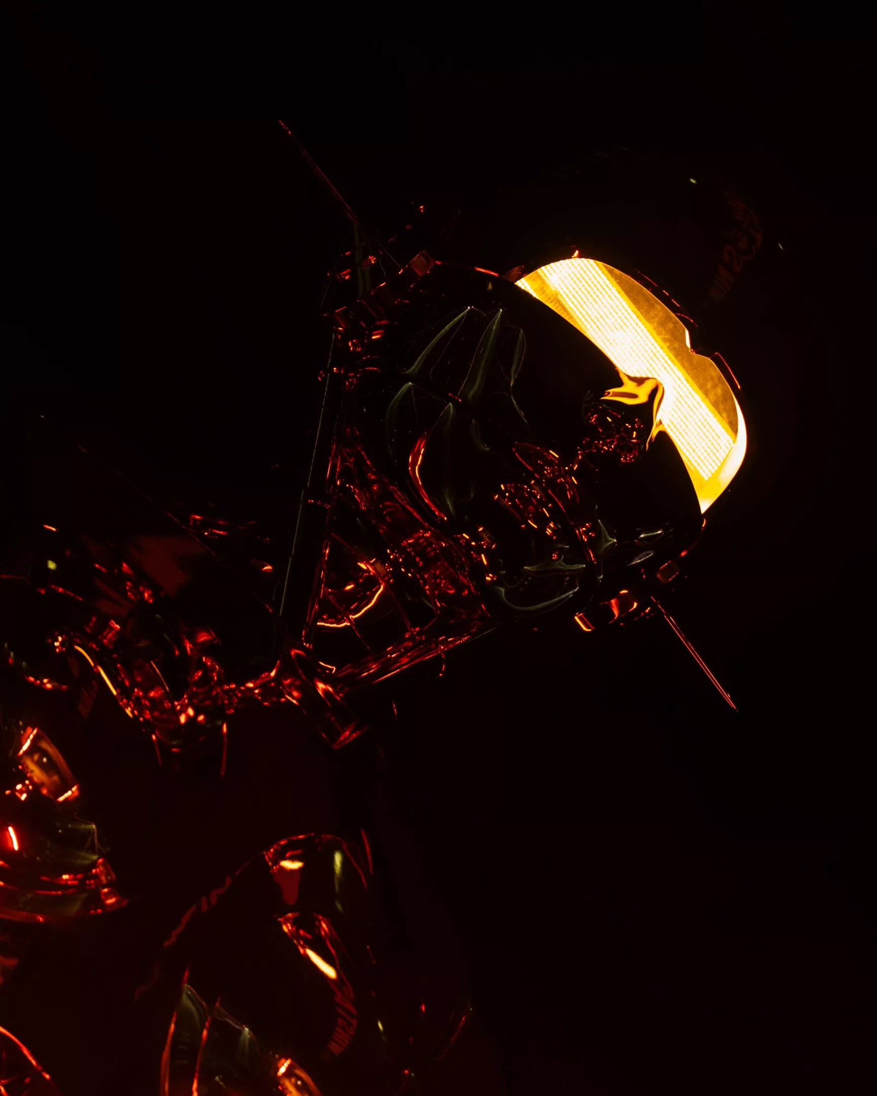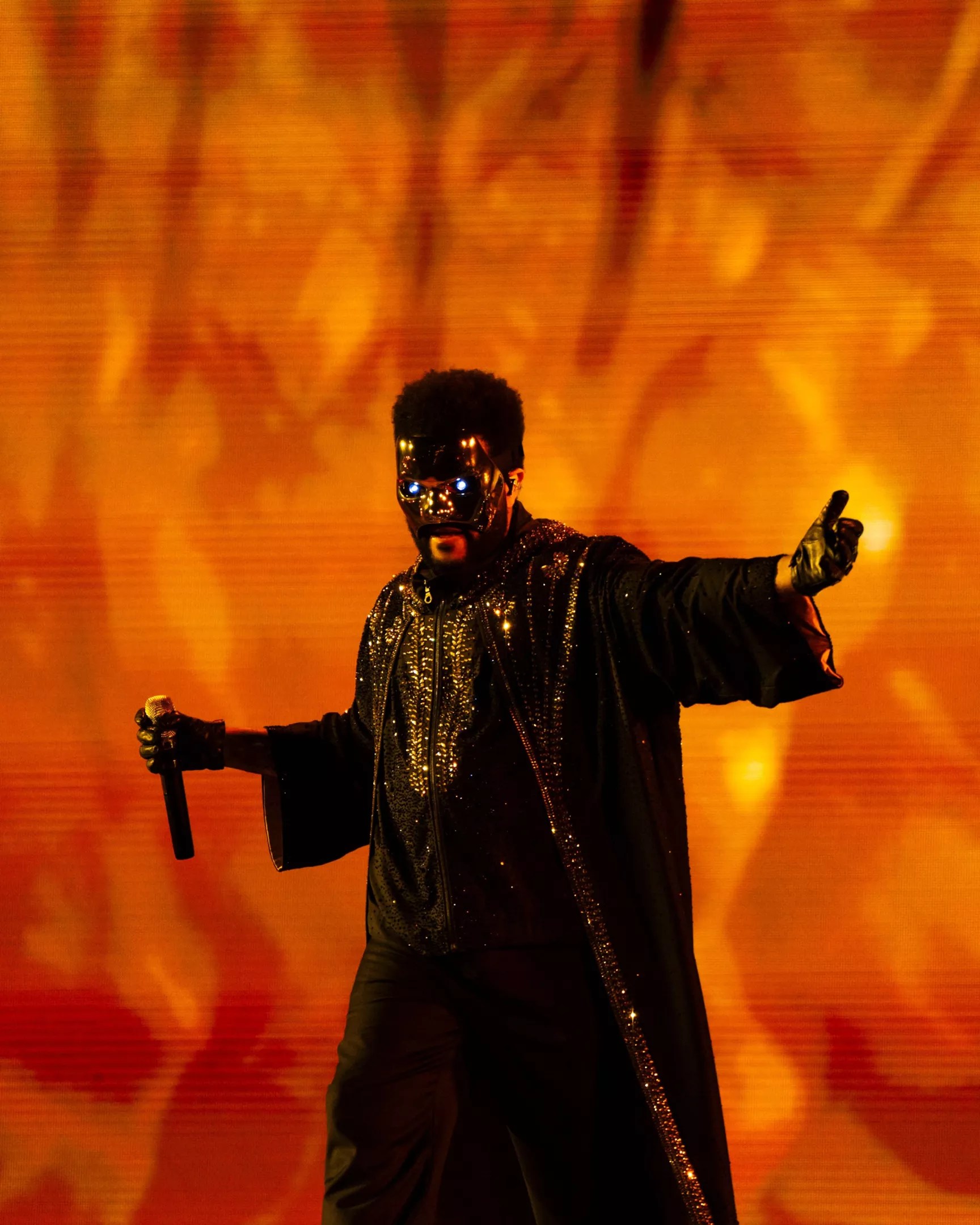 At around 9 p.m., the lights went down as a couple of dozen dancers adorned in red drapes flanked the front of the stage. We first heard his voice, The Weeknd’s unmistakable falsetto singing his part of “The Abyss,” a new song from Hurry Up Tomorrow featuring Lana Del Rey. He emerged from behind his troupe of dancers wearing a sparkly black robe and a metal mask with glowing eyes, which he performed in for the first few songs. In the center of the stadium, an enormous metal colossus with similarly glowing eyes fixed its gaze on him and rotated around the stadium following in whatever direction he was performing.