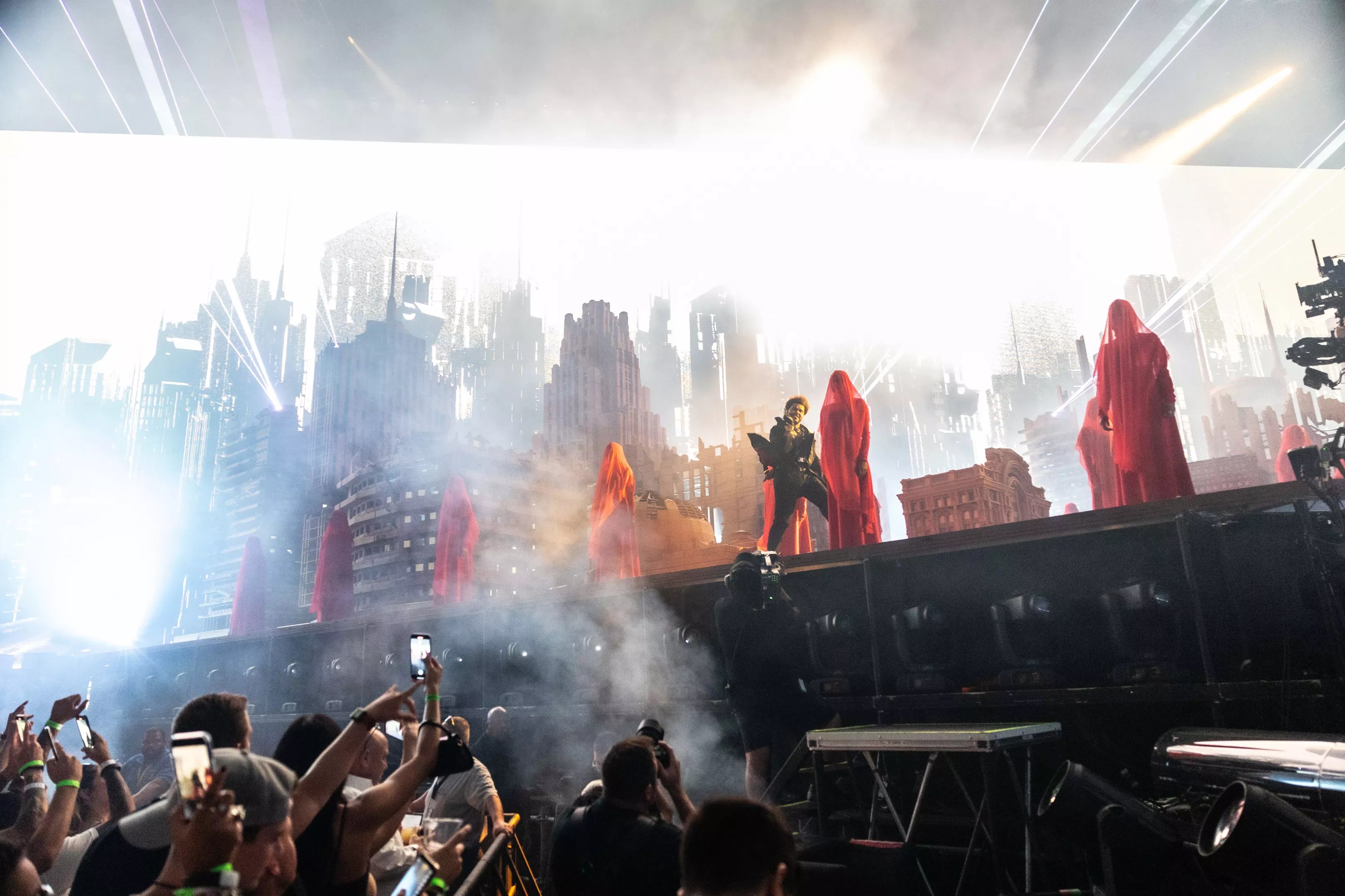 The Weeknd’s two-hour set kicked off with “Alone Again” and “Gasoline.” Out came a procession of performers covered head to toe in flowy gauze-like burkas – evoking scenes from the dystopian book and series The Handmaid’s Tale – before the sound of “Sacrifice” filled the stadium.