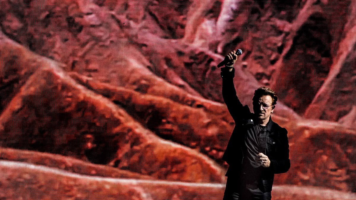 “For those holding on to the American dream: sing,” Bono said. “For the left and the right and all of those in between: sing. We will find common ground and seek higher ground.”