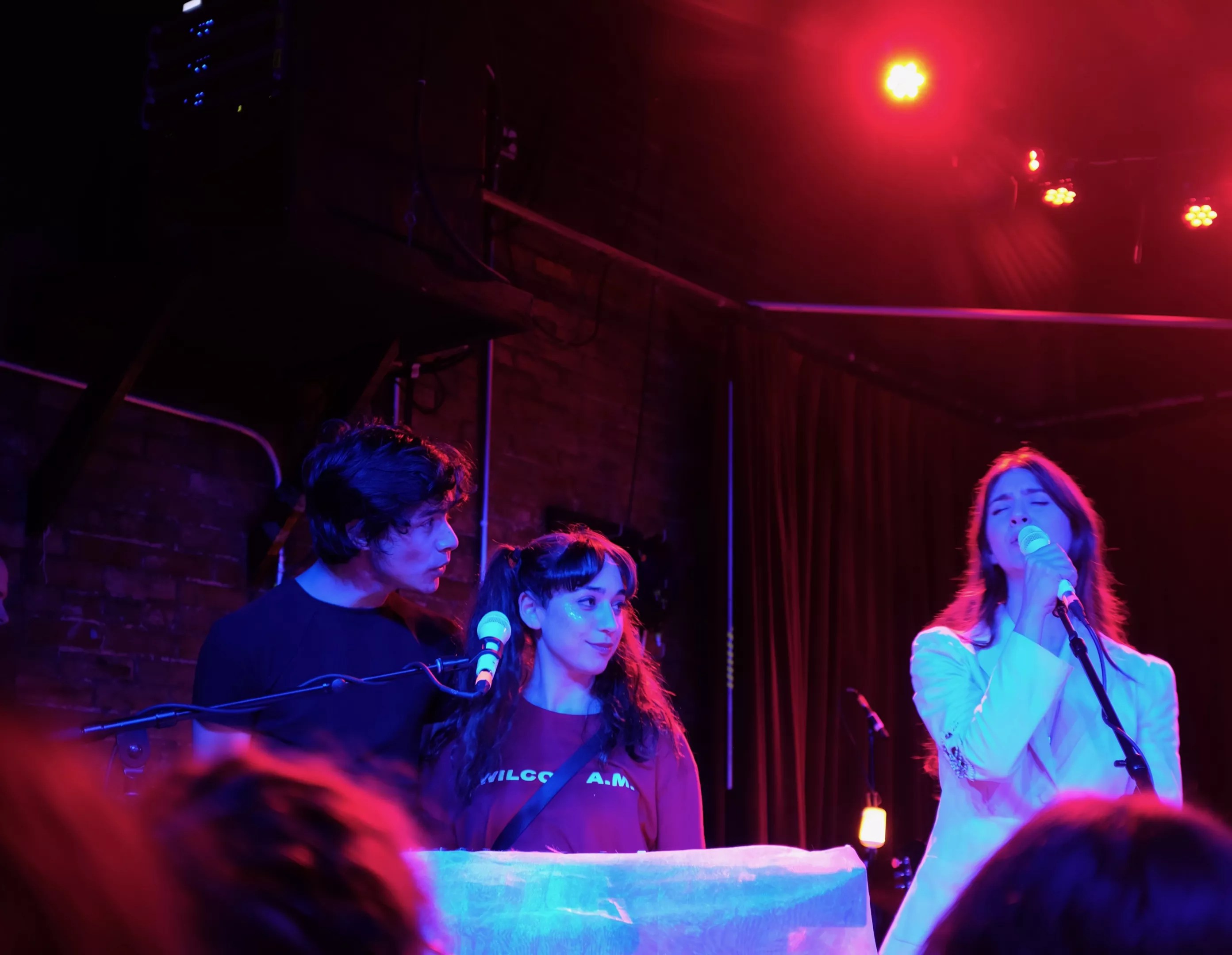 “The meaning of life doesn’t seem to shine like that screen,” Mering sang as the audience watched entranced. A watery light shone up from the stage onto the performers, and the words filled the space as much as the heat.