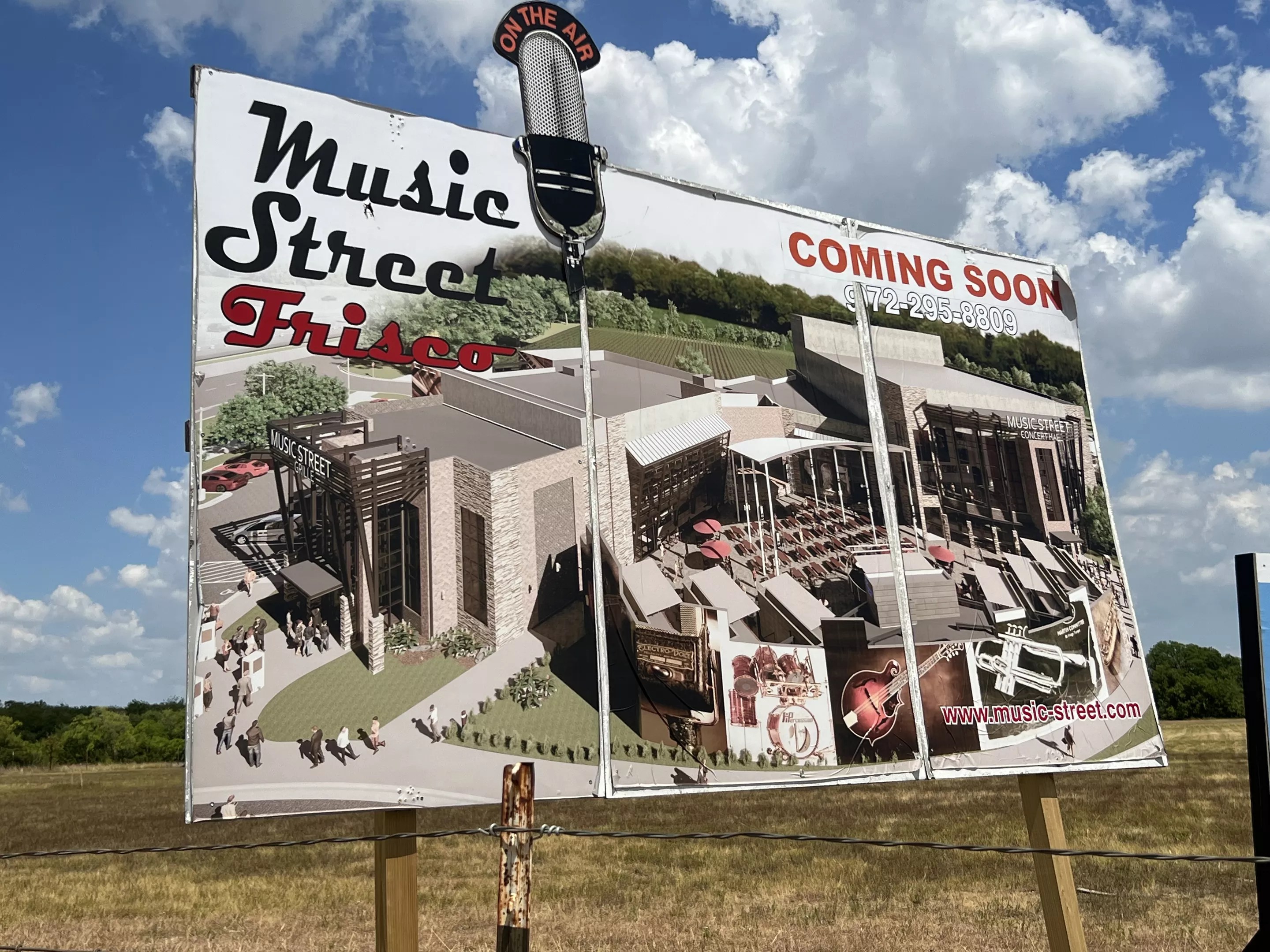 “Music Street Frisco coming early 2021,” the sign read at one point. As you may have noticed, it’s late 2022 and any space beyond the sign still looks like a waste land. The sign now doesn’t specify when the project will be done. Only that it’s “Coming soon.”