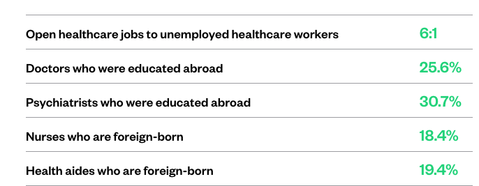 But the report argues that they are needed to keep the system going, particularly in Texas. “In Texas, a state where nearly one out of every 7 people is currently elderly, finding enough healthcare workers remains a challenge — and one that will likely worsen in the future,” it argues. Here are the Texas stats they cite: