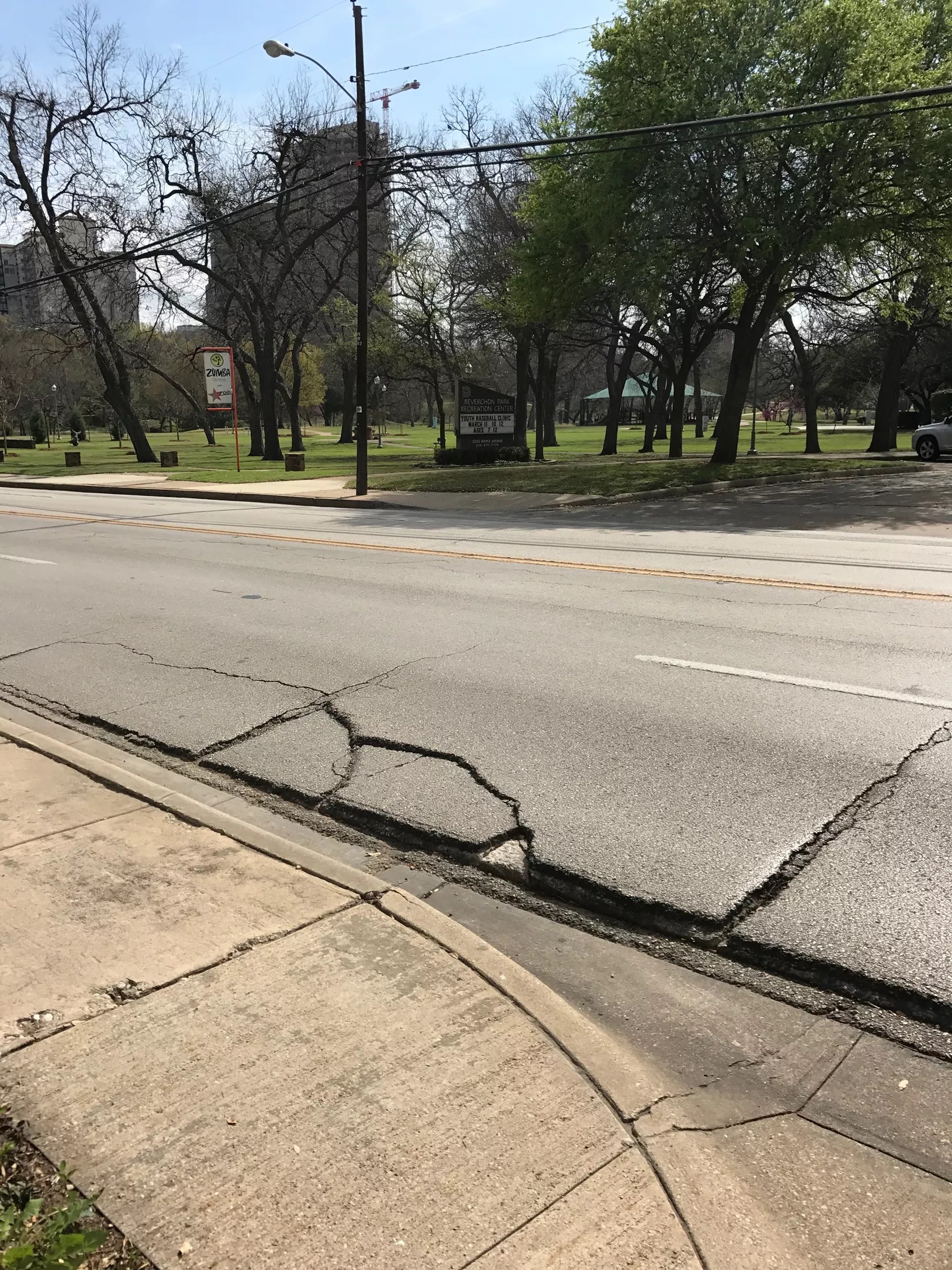 Not quite a pothole, but these kinds of cracks in the road are fun because one twist of your steering wheel and you are off the road and into another county. This is across from Reverchon Park Recreation Center on Maple Avenue and it’s one 18-wheeler driving on it away from being a full-blown pothole, just like a caterpillar finding its way into a beautiful butterfly.
