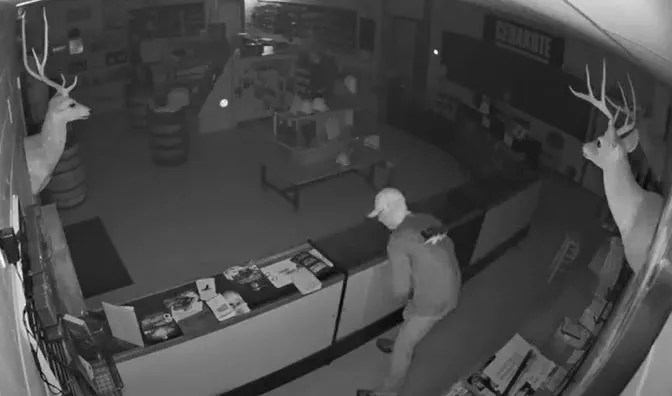 Security camera footage shows the man riffling around in the cases, using a flashlight to guide himself in the dark room and snatching up handguns. When he eventually ran out, he’d made off with 21 firearms.