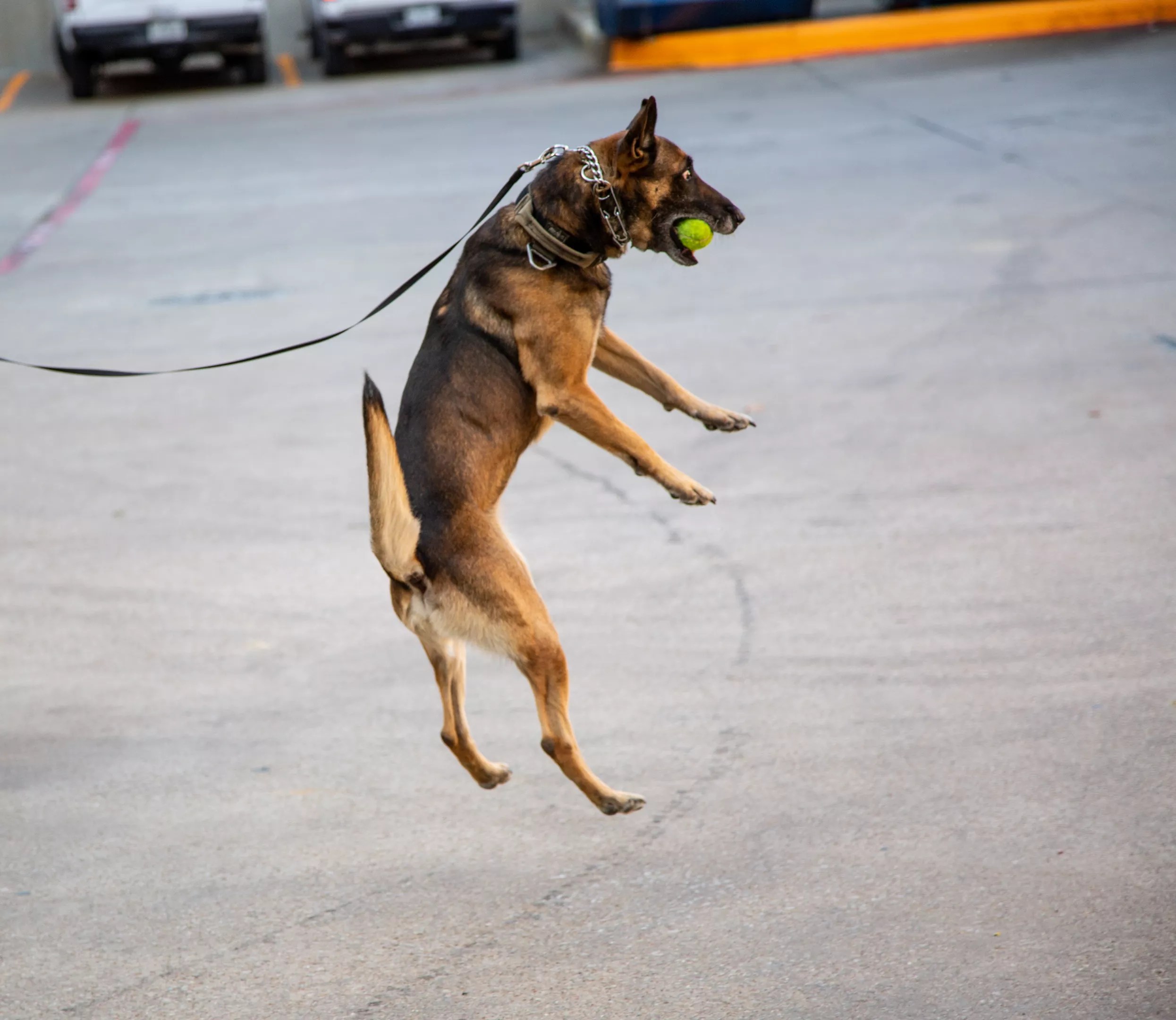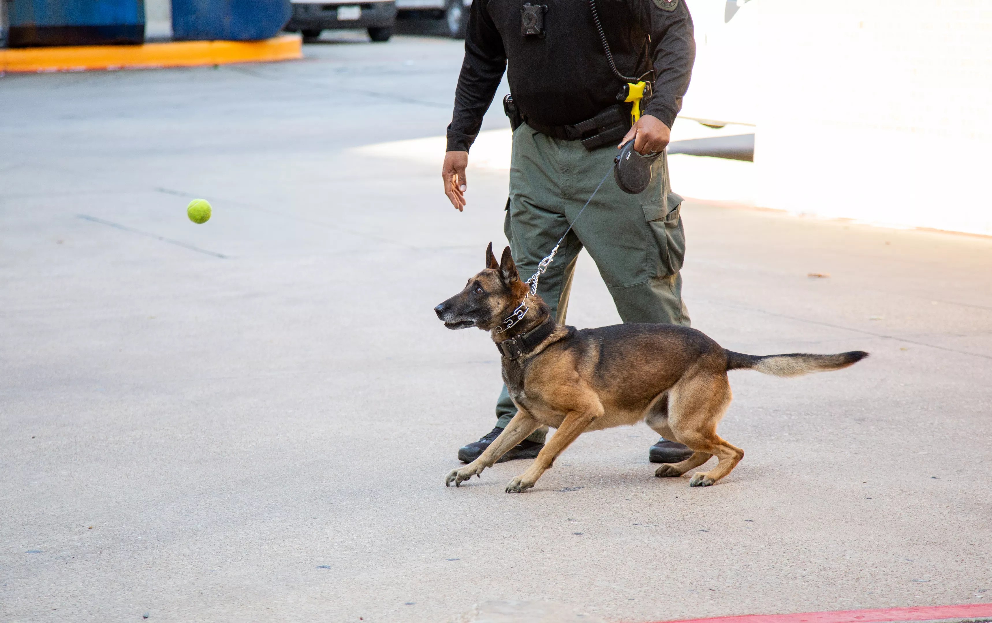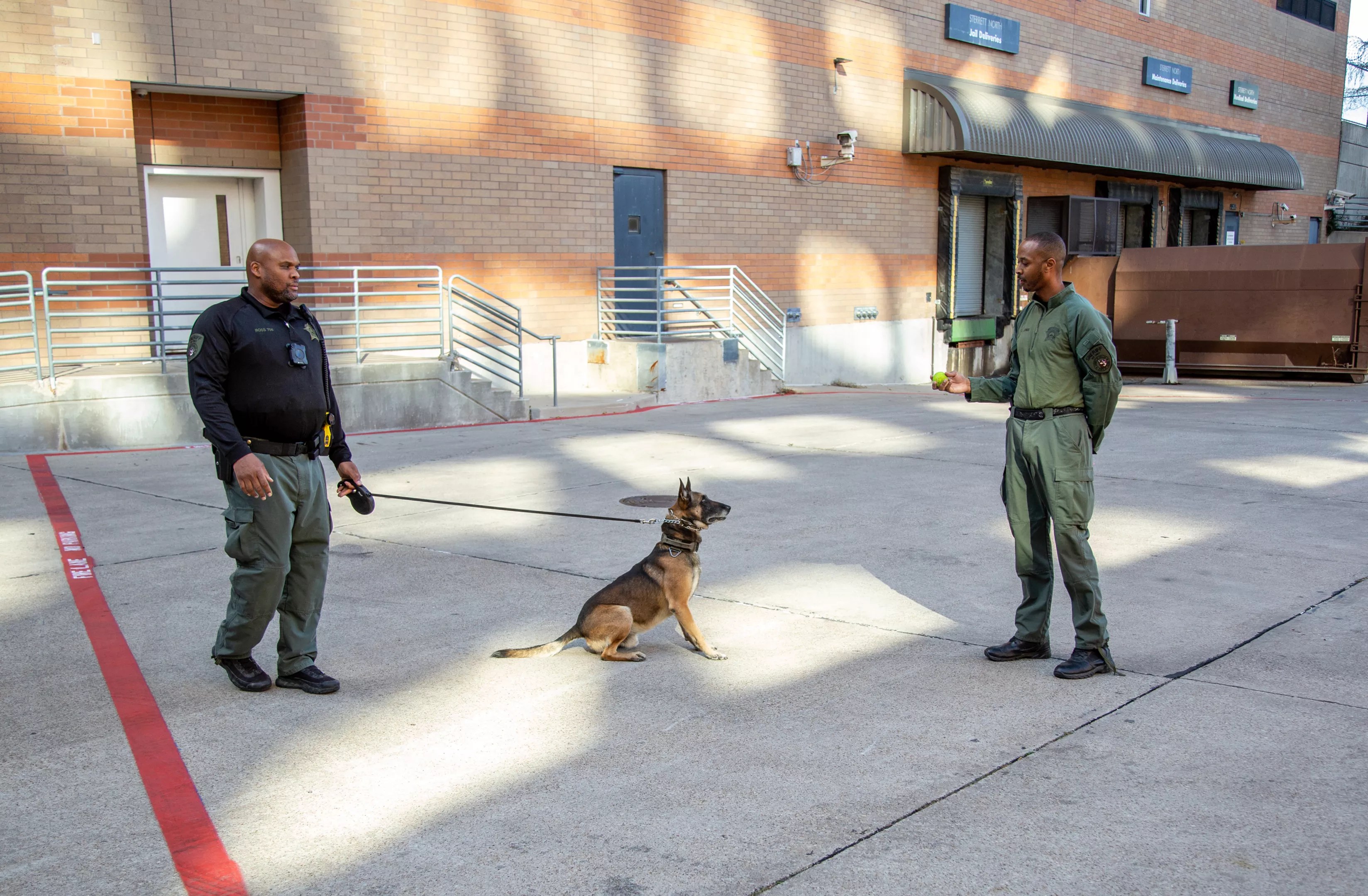 In a parking lot behind the Dallas County Sheriff’s Department, Ross’ dog, Chapo, is shaking with pent-up longing as he stares at the green tennis ball in Latorrez Jones’ hand. The ball is the sole toy he trains with. All of his desires, urges and training focus on that single orb. Latorrez Jones throws it and Chapo launches into the air at the ball. Release.