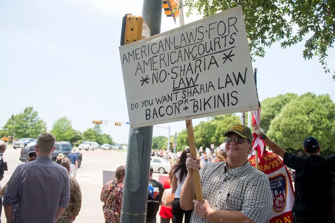 Hundreds of demonstrators gathered on Saturday for a “March Against Sharia” in Richardson, rallying outside the Islamic Association of North Texas building at the intersection of Abrams Road and Centennial Blvd. Counter-protestors gathered along the opposite side of Abrams, outside the Islamic center, to protest the protest.