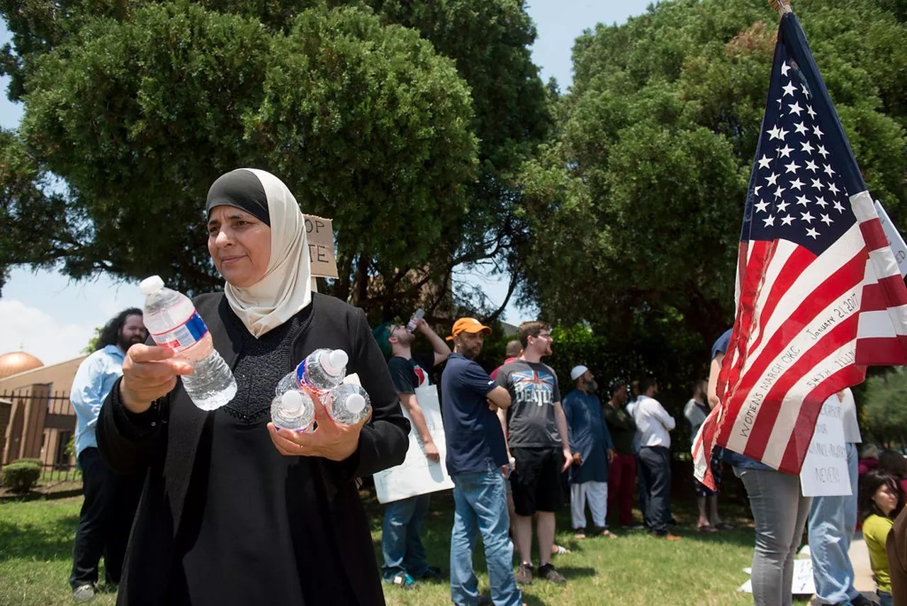 Nora Shuaid hands out water to counterprotestors at the anti-Sharia march.