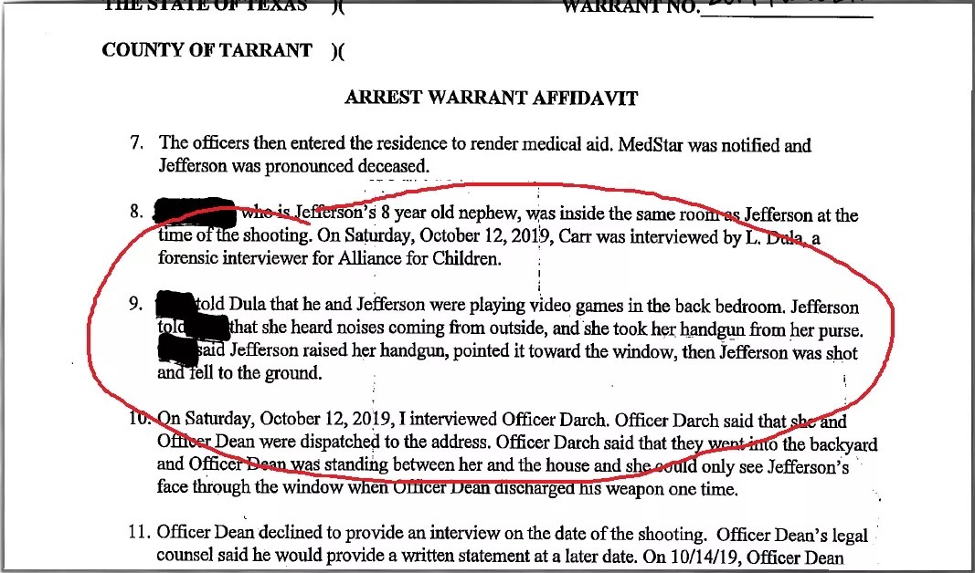 Read the murder warrant for former Fort Worth Police Officer Aaron Dean, as it talks about an interview of Jefferson’s 8-year-old nephew by a police investigator: