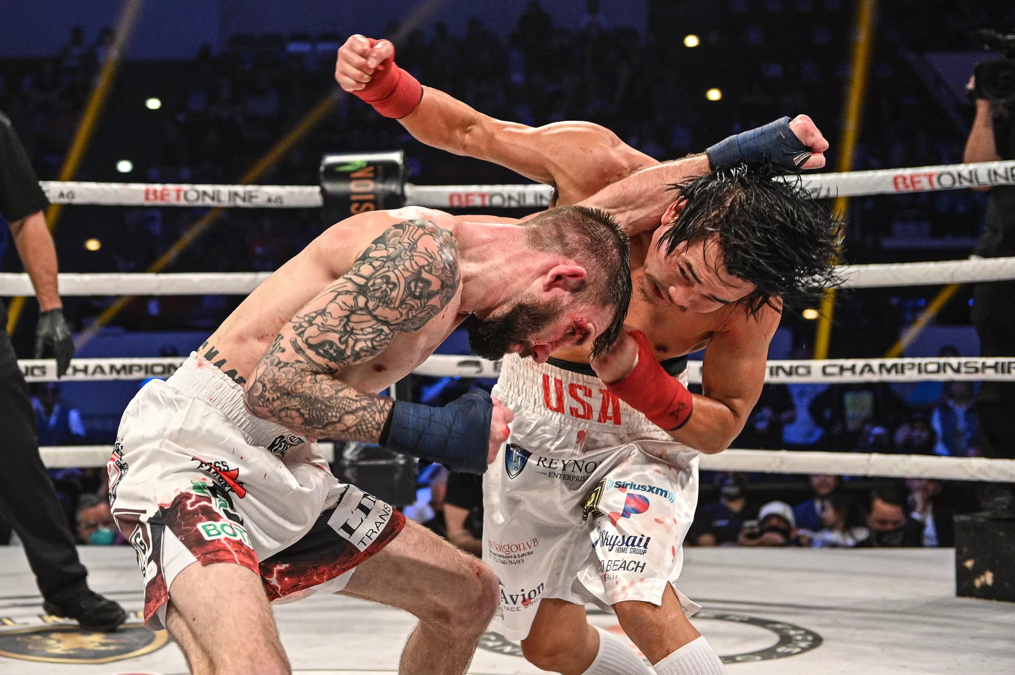 Opponent Dat Nguyen ducks Bedford’s jab and delivers an uppercut hook.