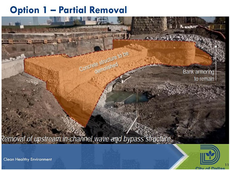 City staff and the Dallas park board have both recommended partial removal, paid for with funds allocated by the Trinity Watershed Management department. The funding would come from bond money that voters approved in 1998 for improving the Trinity. A total removal would have required the city to find money elsewhere.