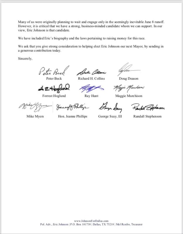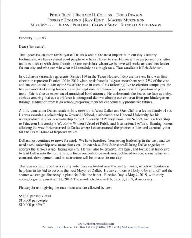 “The race is short,” a letter pitching Johnson to potential donors reads. “Eric has a strong voter base cultivated over the past ten years, which will certainly help him in his bid to become the next Mayor of Dallas. However, there is likely to be a runoff and the sooner we can get financing in place for Eric, the better.”