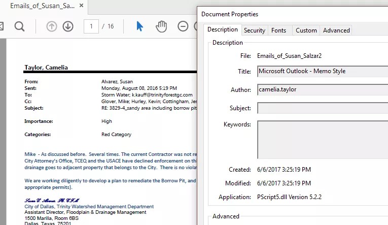Indeed, the missing email was included this time. But here’s the problem. Metadata from the PDF file Alvarez sent me June 7 showed that it was created June 6, six hours after I sent her my first email. The document Susan Alvarez emailed June 7, supposedly a copy of what she had sent Ben Sandifer on March 3, was created the same day she received the writer’s email – June 6. Jim Schutze