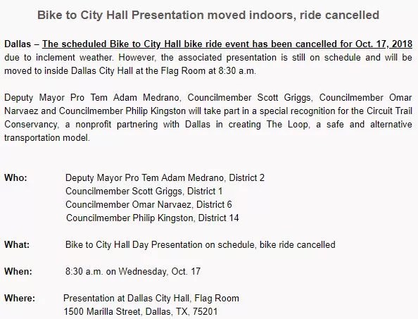 Anyone planning to gather outside Dallas City Hall early today and cheer as council members pedal their bikes into work for the Bike to City Hall event can sleep in instead. The event has been canceled because of inclement weather.