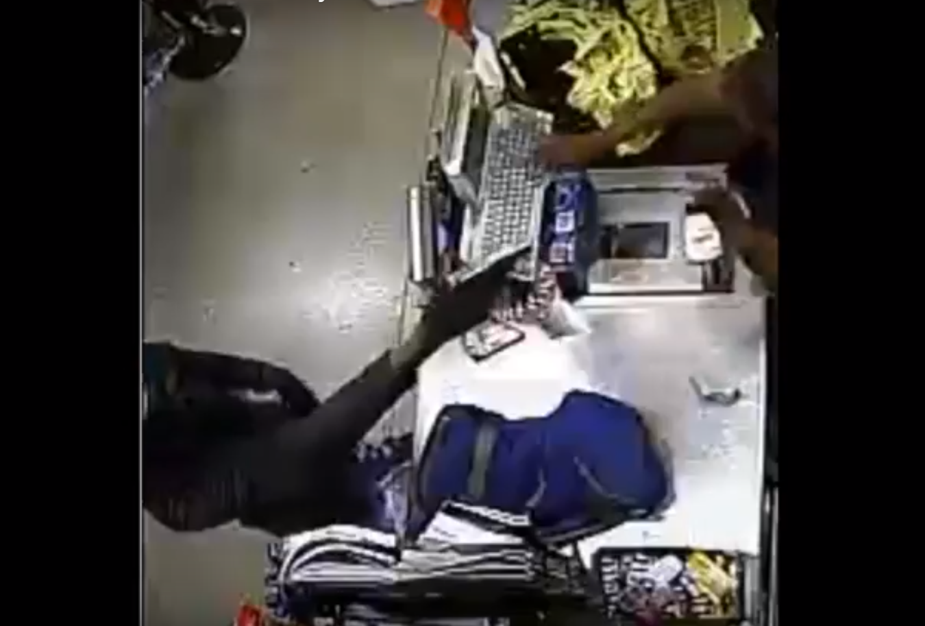 Once inside, he pointed the gun at 27-year-old Gabrielle Simmons, who was working a register at the discount store. As documented by surveillance video, Simmons did what the robber demanded – ejected her cash drawer and handed it over to be placed in the gym bag.