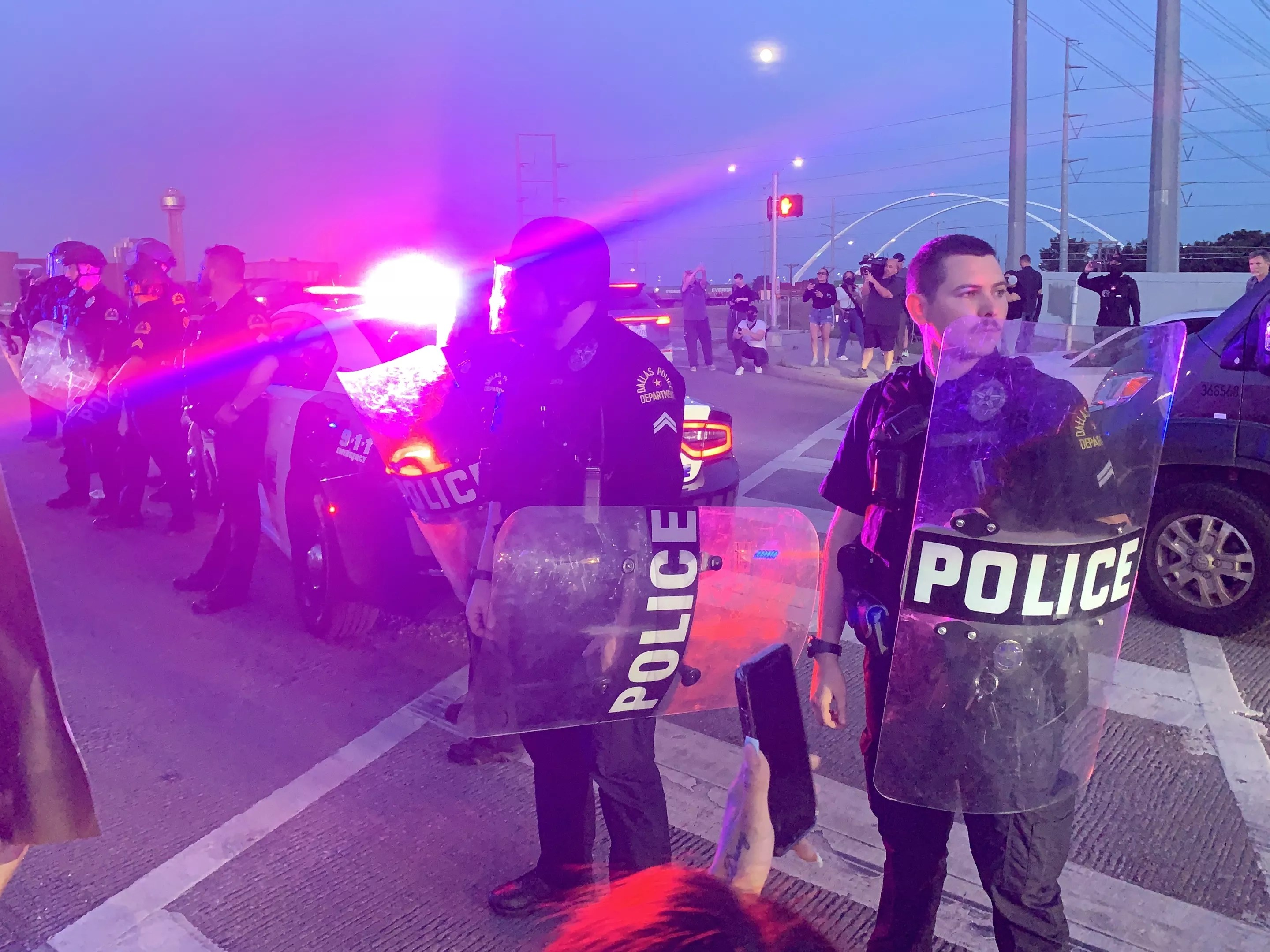 Around 9:30 p.m. Monday night, hundreds of protesters marched towards the Margaret Hunt Hill Bridge, which connects West Dallas to downtown. Police wearing masks and holding shields and batons blocked their way. Red and blue sirens glowed behind the line of officers, and the lights of downtown’s skyline slowly faded between green and purple behind the bridge.