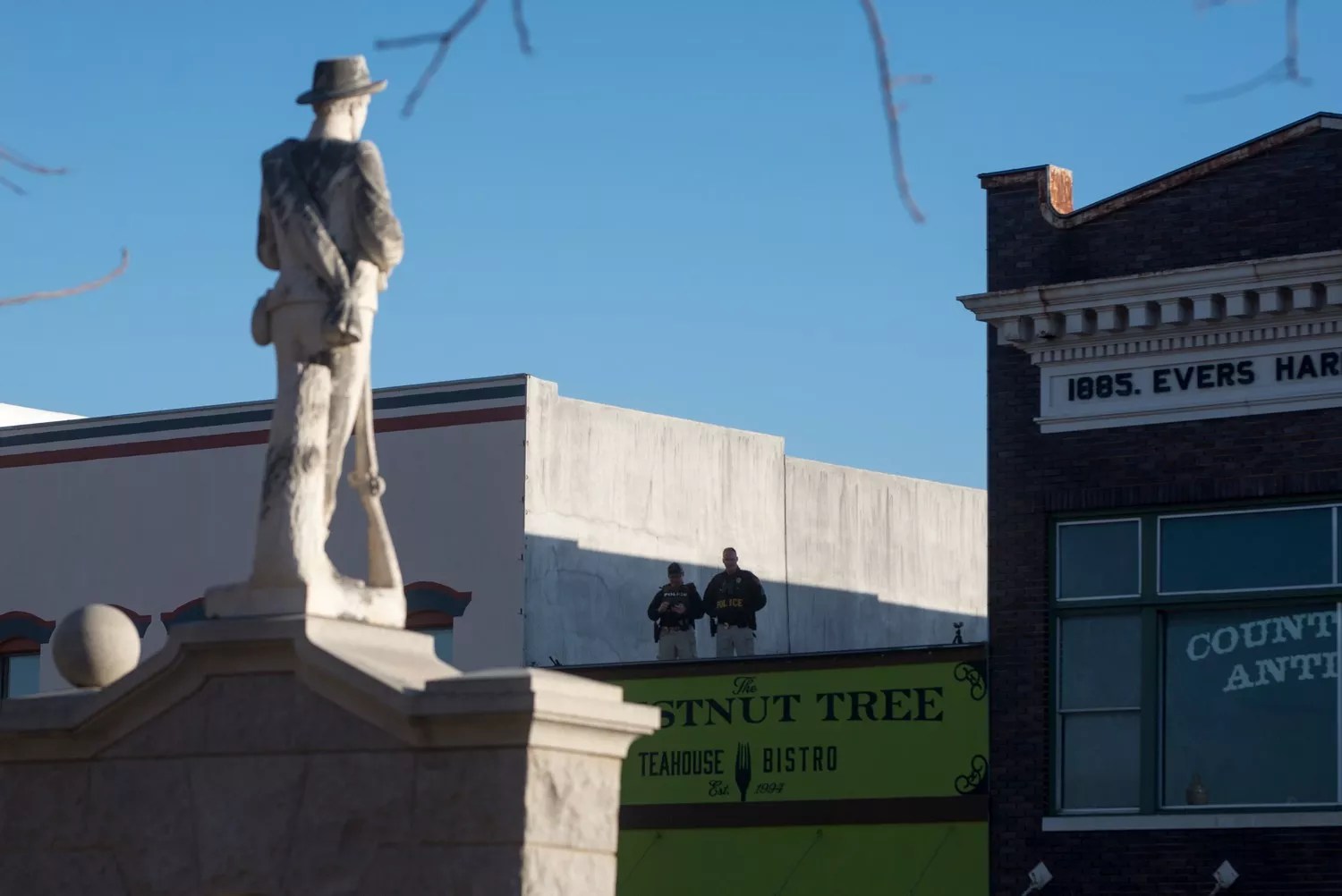 A small group of protesters joined them, surrounded by media and a heavy law enforcement presence. Sharpshooters positioned themselves atop buildings. Uniformed officers stood near street corners, at the courthouse and on its lawn, and across the street in front of businesses frequented by locals and tourists. They all looked ready for a gunfight, but most of the peaceful protesters didn’t appear armed.